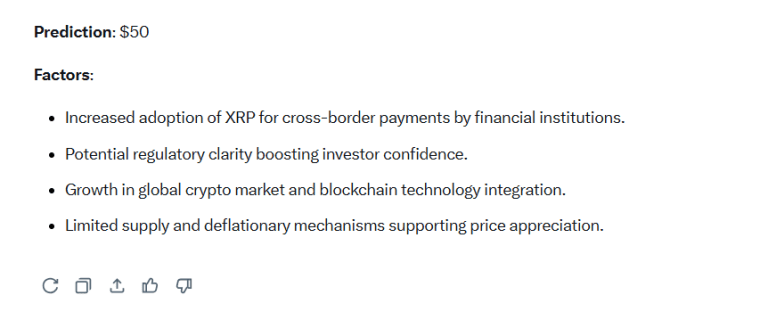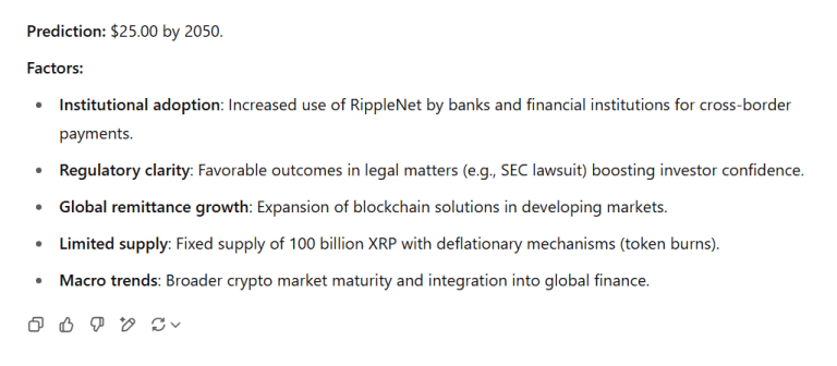 具體來說,ChatGPT預測XRP到2050年將達到25美元,受到機構採用和監管透明度的推動。在這個50美元的價格下,1,000 XRP將值25,000美元,5,000 XRP將增長到125,000美元,而10,000 XRP的價值將達到250,000美元。