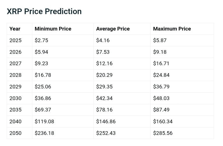 也許最看漲的預測來自加密平臺Telegaon的分析師。這些分析師預計XRP在2050年前將達到最高285美元的價格。在這個價格下,1,000 XRP將值285,000美元,5,000 XRP的價值將爲142.5萬美元,而10,000 XRP將增至285萬美元。