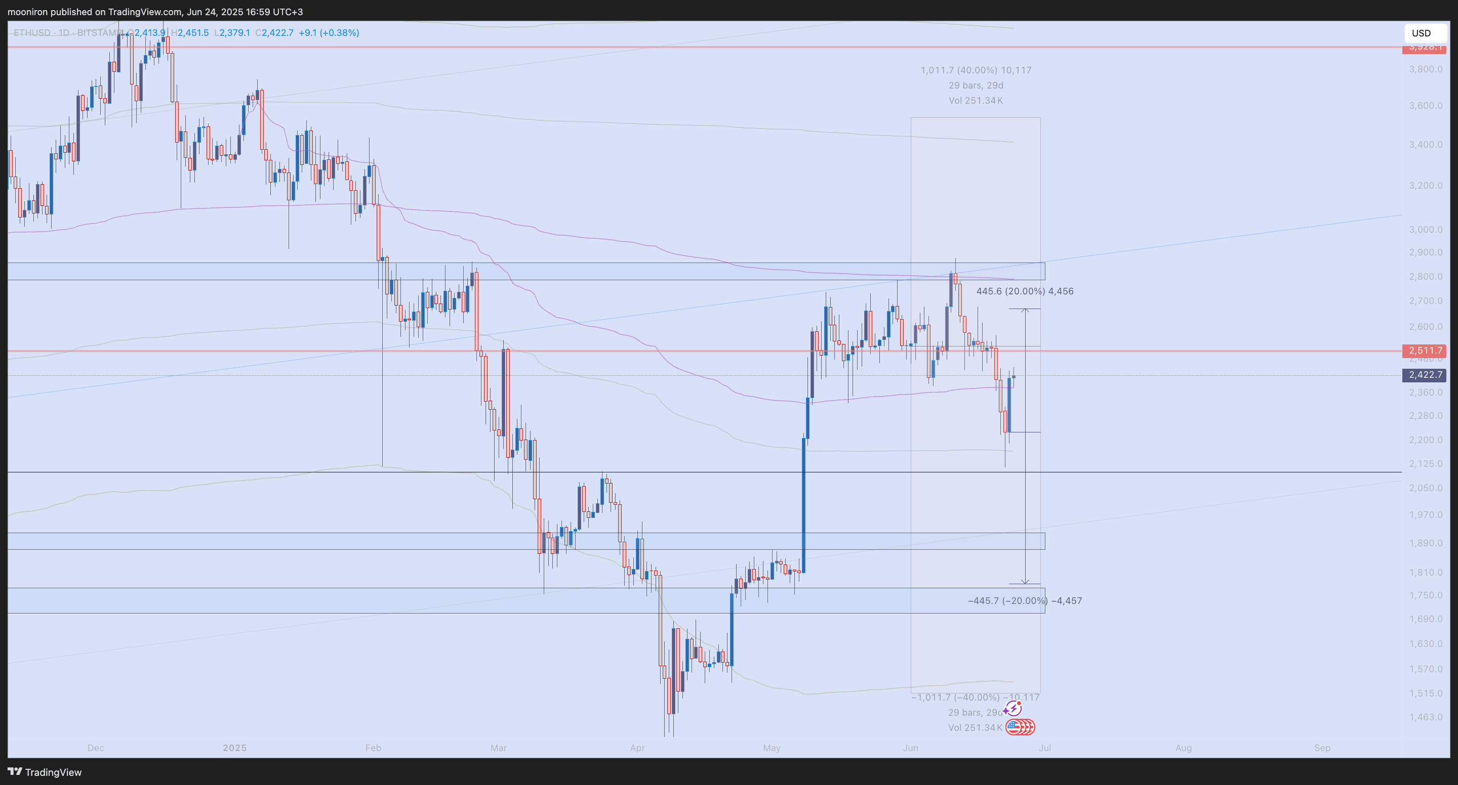 在向$2700進發未果後,以太坊經歷了一次回調,跌至$2100。價格結構在$2500水平附近停滯,相對於比特幣表現非常疲軟,並遭遇了劇烈的拋售。