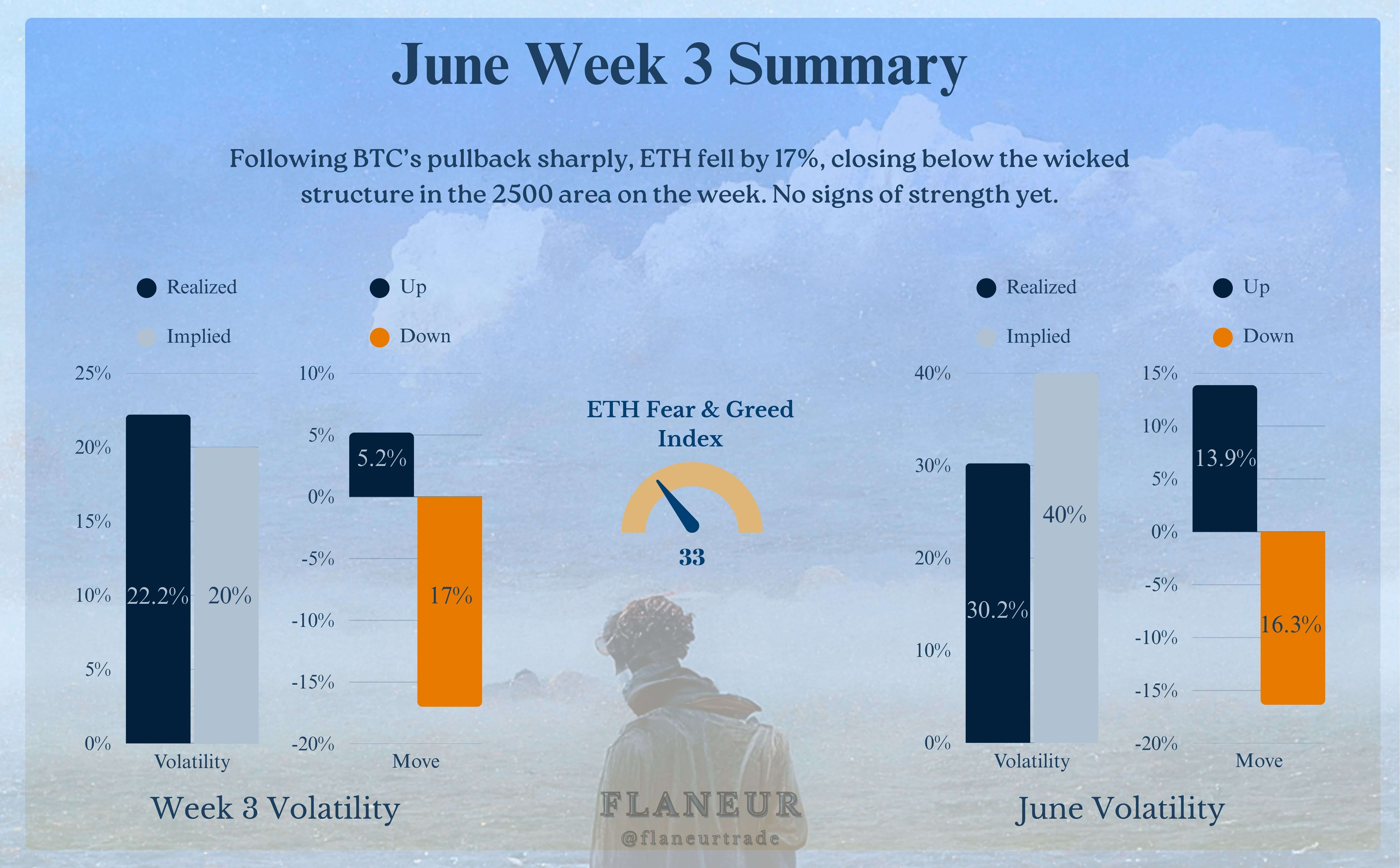 它在周線圖上通過那個“長影”結構向下突破,伴隨着強烈的拋售。然而,昨天它與比特幣迅速反彈,並重新進入該區間。周隱含波動率在$1780-$2670範圍內。由於它仍未完全恢復強度,我將重點關注比特幣。