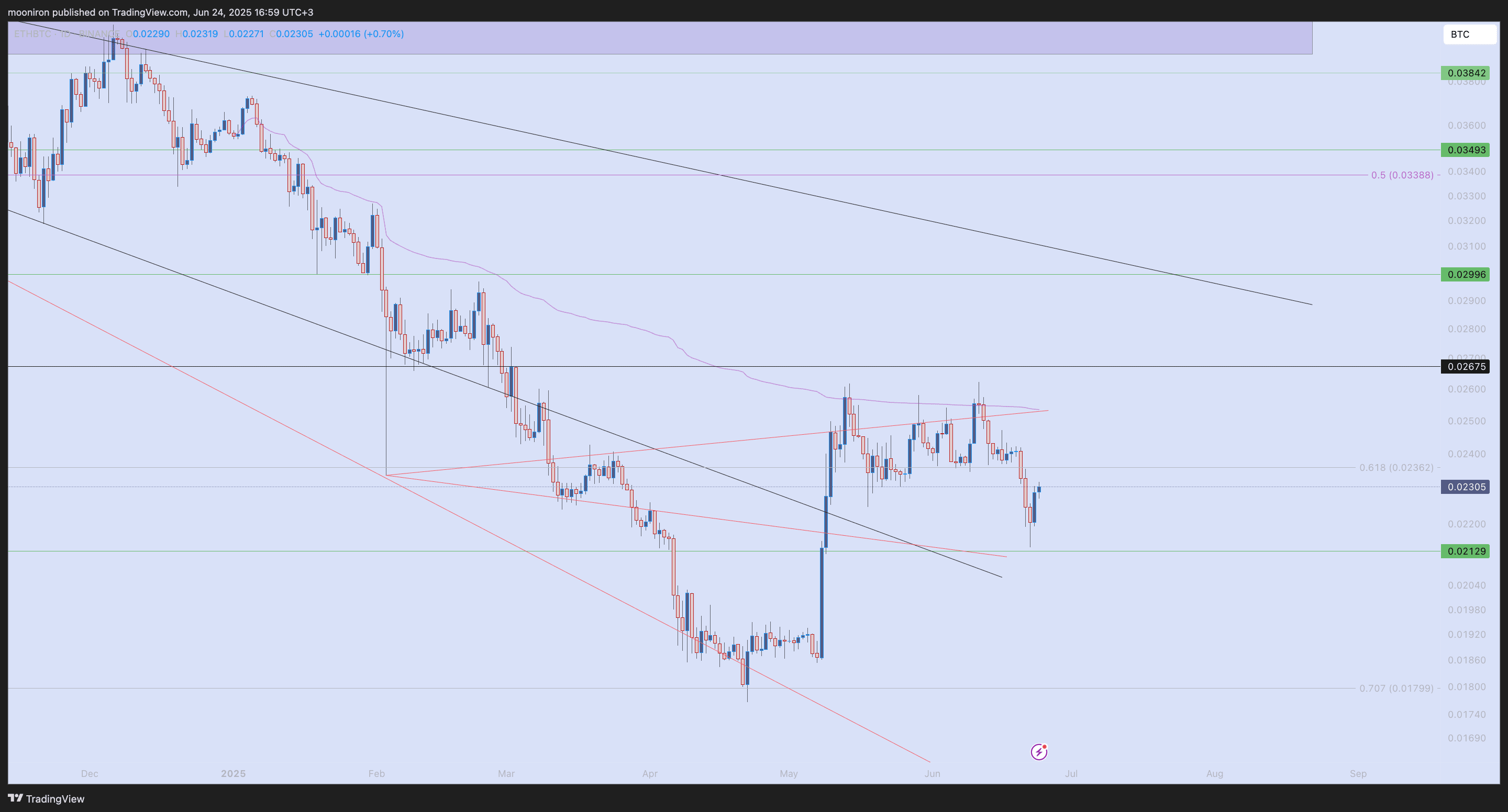 低高點和高低點的結構已經向下突破。然而,目前似乎在0.022區域找到了支撐,這一點我已經提到很久了。由於我預計當我們從這裏看到上漲時會有劇烈的波動,納入以太坊的多頭頭寸是合乎邏輯的。然而,對於更大的頭寸,最好等待在0.026以上持續持穩;否則,趨勢仍然是向下的。