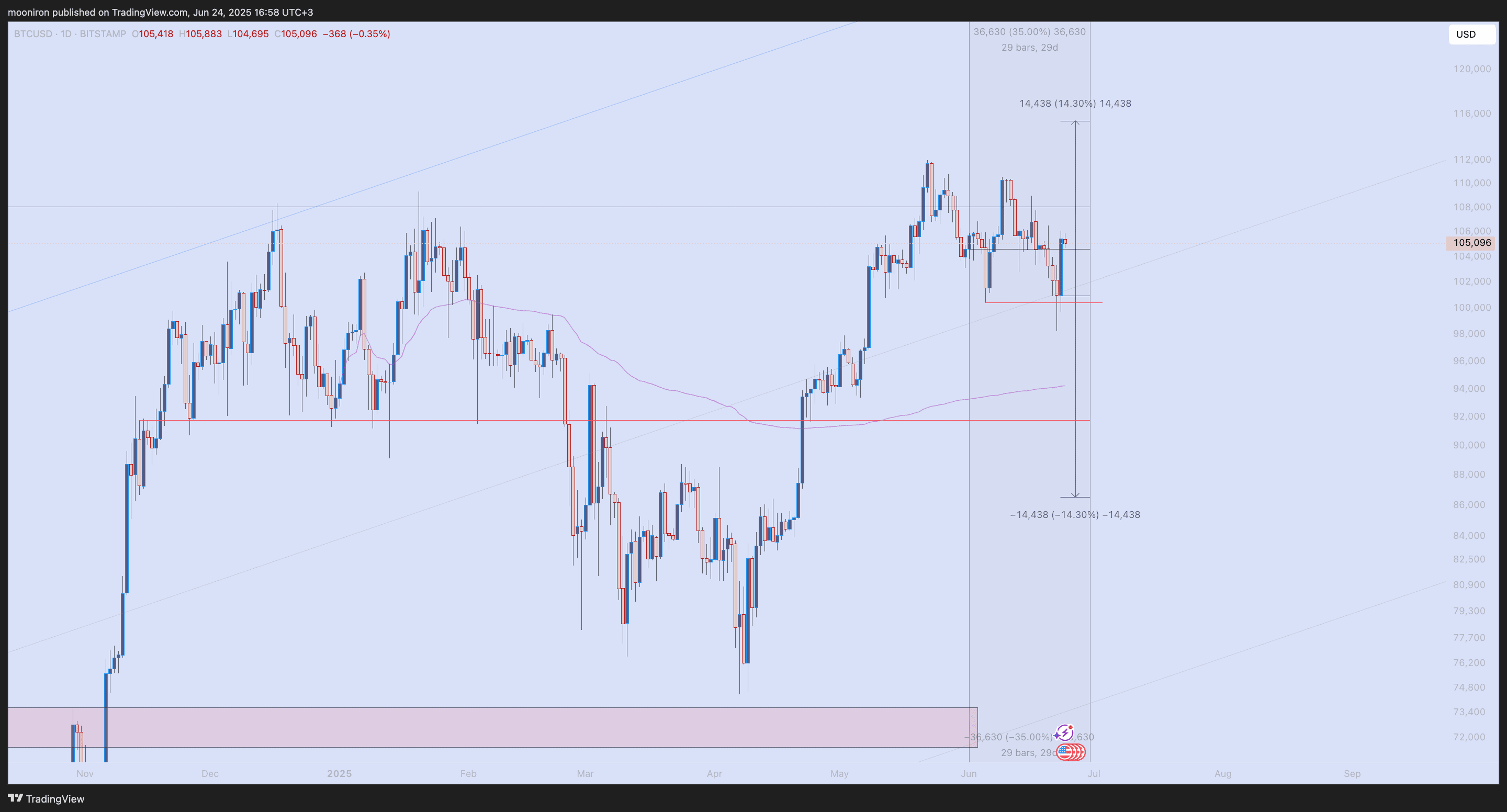 上週,我提到雖然我預期會出現新的歷史高點,但由於預期的風險,我對此持謹慎態度。隨着昨日的周開盤,價格漂亮地回升至月開盤之上。只要價格不跌破$103.5k區域,我將對做空持謹慎態度。作爲第二季度的最後一週,我在想它可能會非常波動或非常平靜之間感到矛盾。在看到更明確的走勢之前,我可能會避免進行太多交易。本週的隱含波動率範圍在$86k至$115k之間。