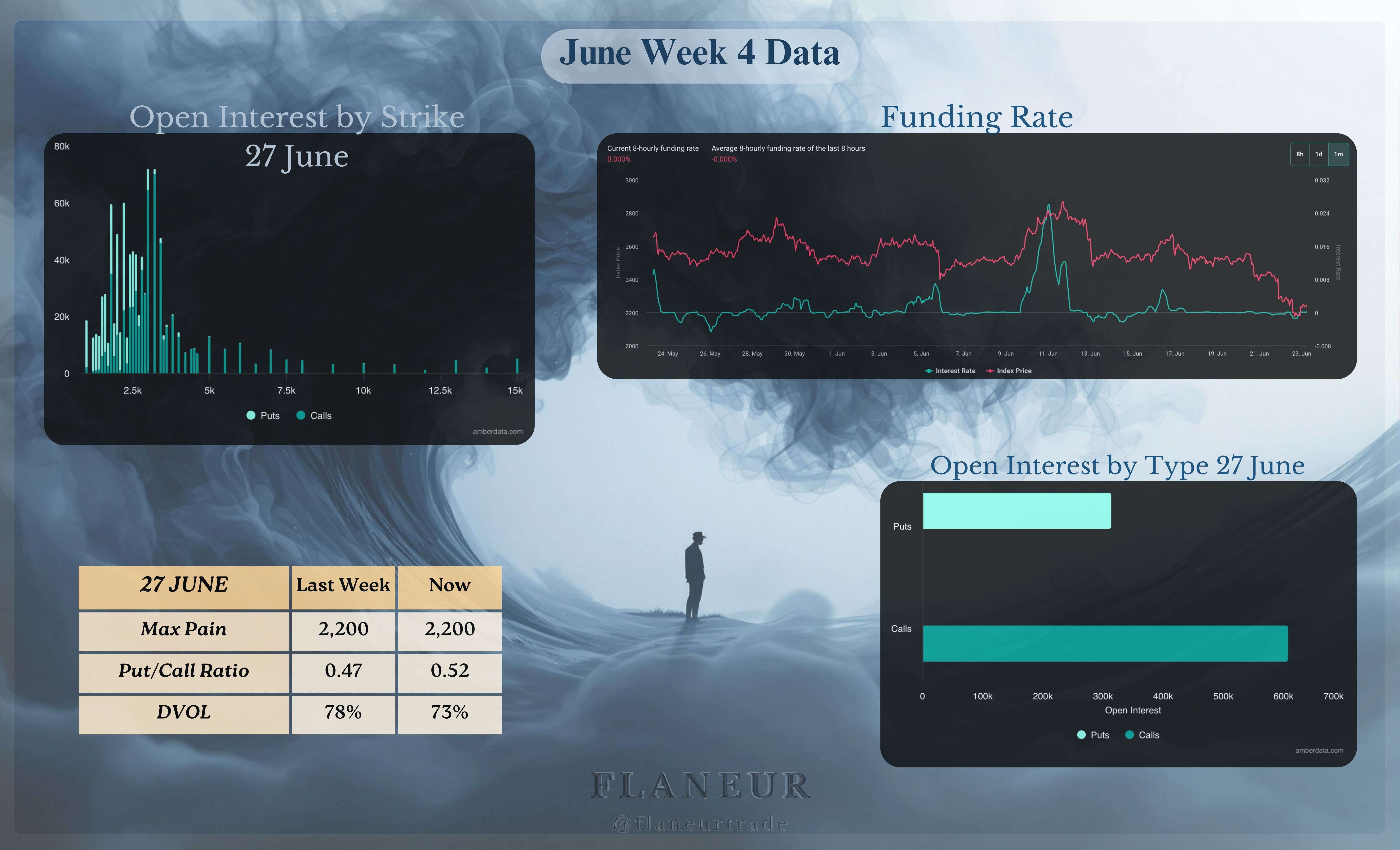DVOL的上升已經暫停;實際上,有所下降。儘管看漲頭寸持續存在,但本週市場情緒仍然看漲,儘管月底合約的P/C比率略微上升至0.52。最大痛苦價格爲$2200,這是它已經停滯了幾個星期的區域。