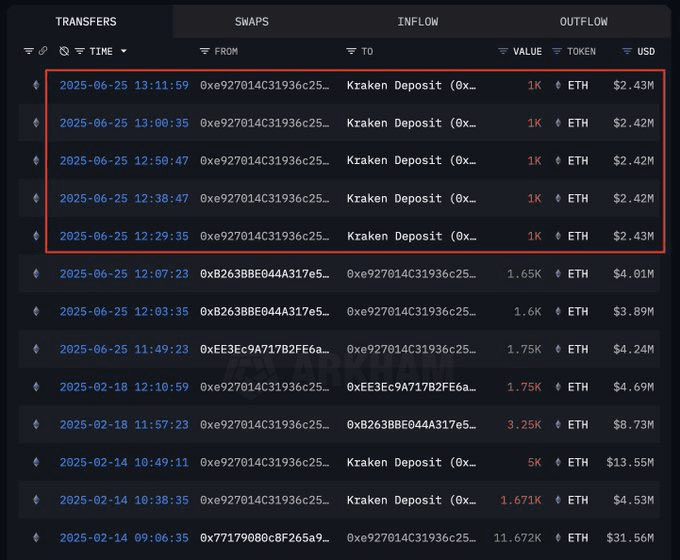 另一位老鯨魚剛剛將價值1210萬美元的ETH直接轉移到Kraken。