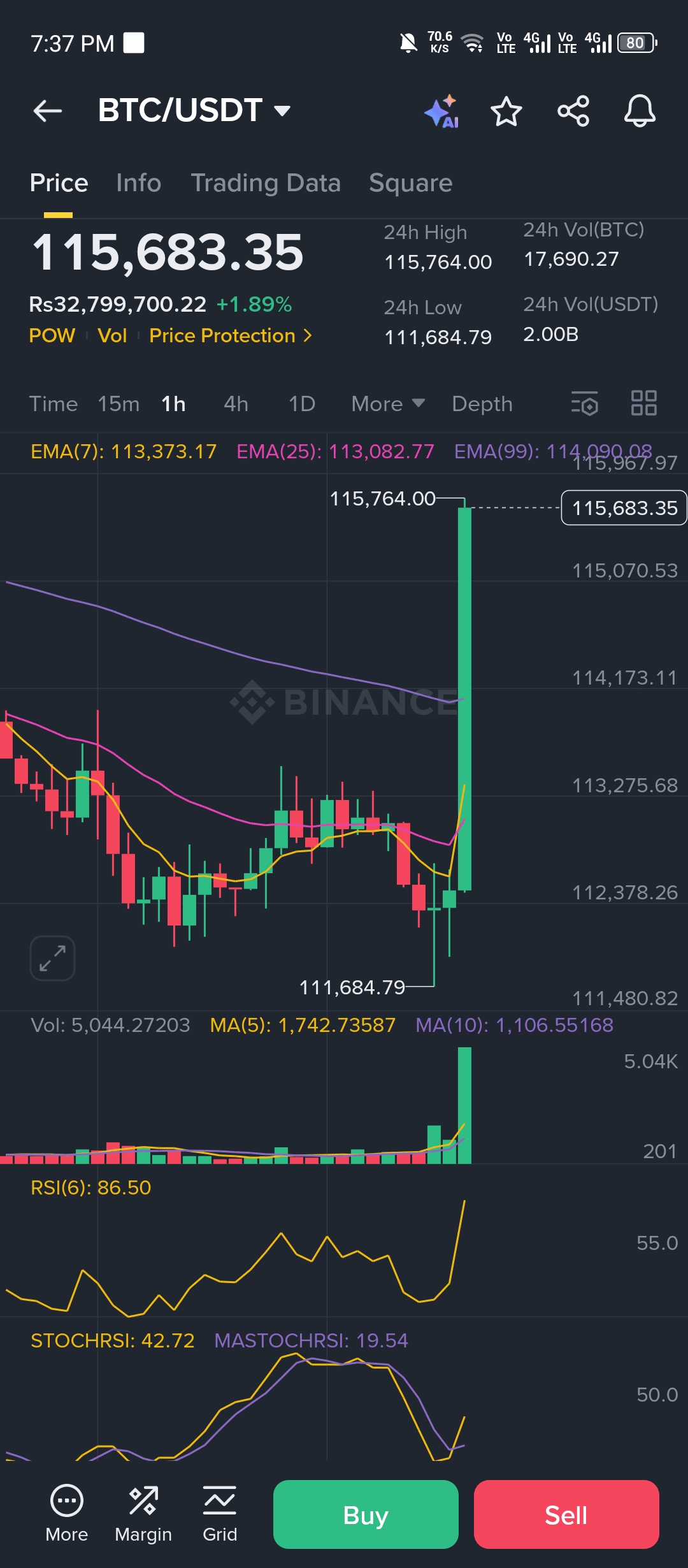 $BTC 剛從$111,684大幅突破至新的高點$115,764,現在交易於$115,683 (+1.89%)。價格行動已大幅高於EMA(10)、EMA(25)和EMA(99),顯示出強勁的牛市動能。然而,短期指標顯示BTC進入超買區,可能在再次上升之前會有冷卻。