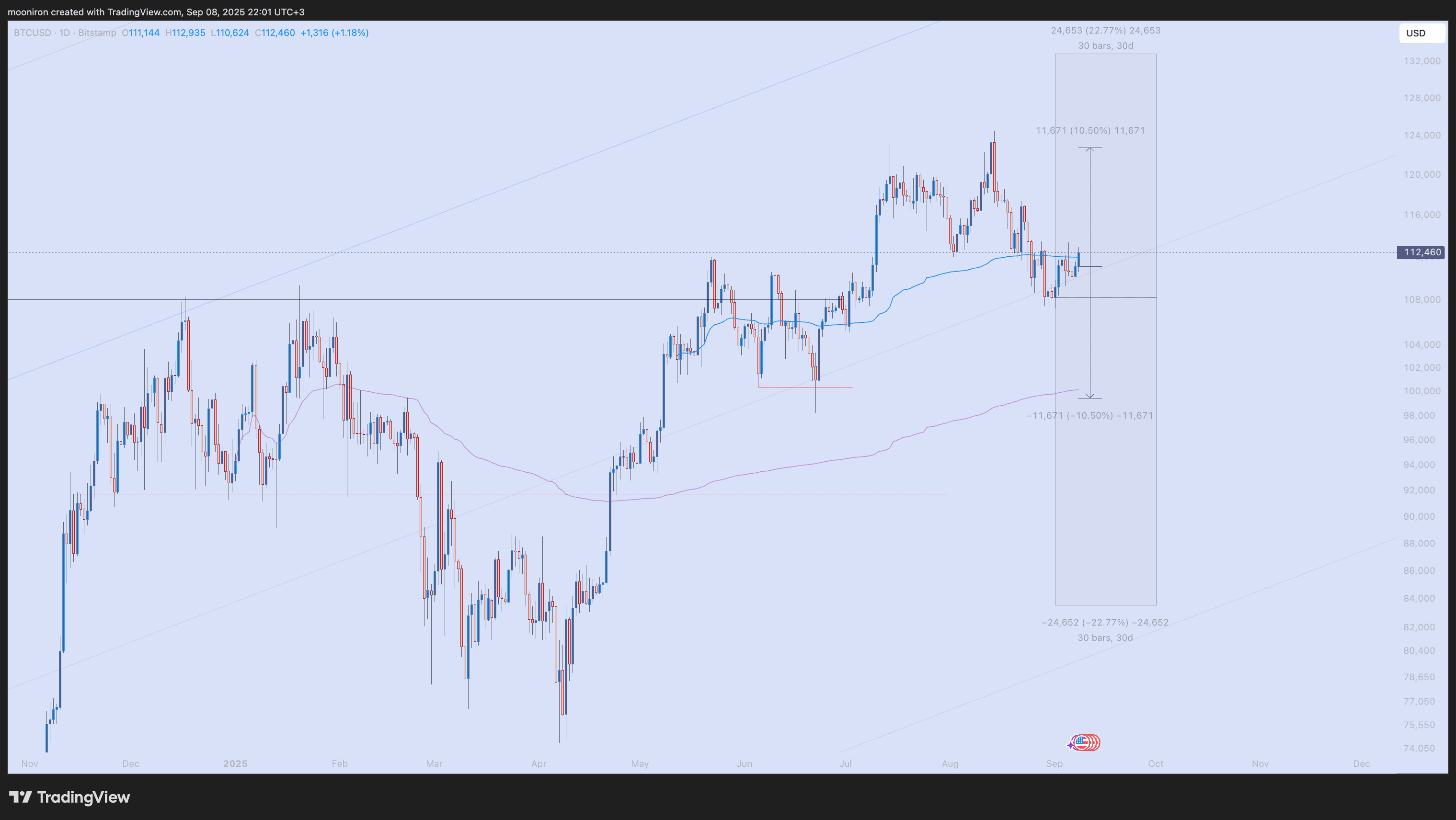 本週的隱含波動範圍在99.5k到123k之間。我預計價格會首先突破113k區域,然後測試118-119k區域。我認爲這個區域正在成爲近期的關鍵水平。從這個區域回調的可能性似乎相當高。因此,我認爲在這些區域的交易需要謹慎,空頭交易可以被構建。