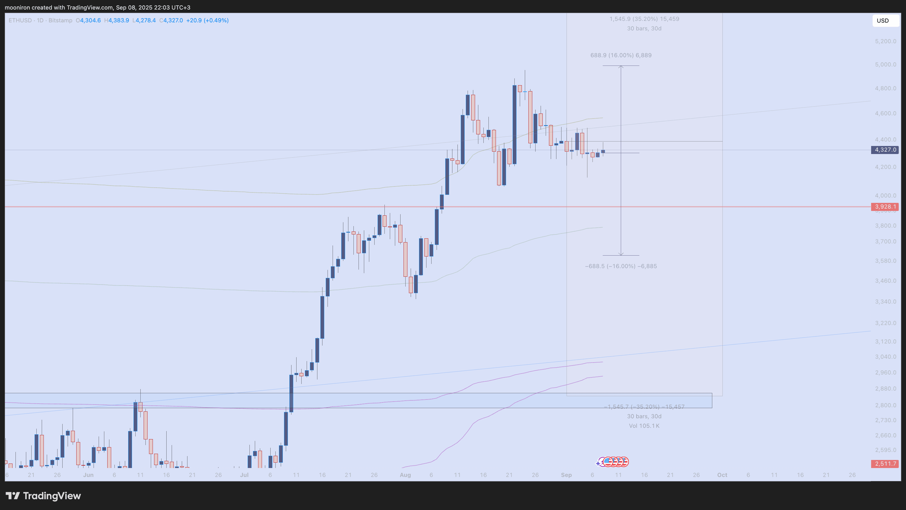 本週的隱含波動範圍在3600到5000之間。我們需要首先看到日收盤在4500區域以上。在滿足這個條件之前,可以說重倉交易更有可能導致損失。在再次測試這個區域後,我認爲回調到3500-3700區域會是一個不錯的操作。