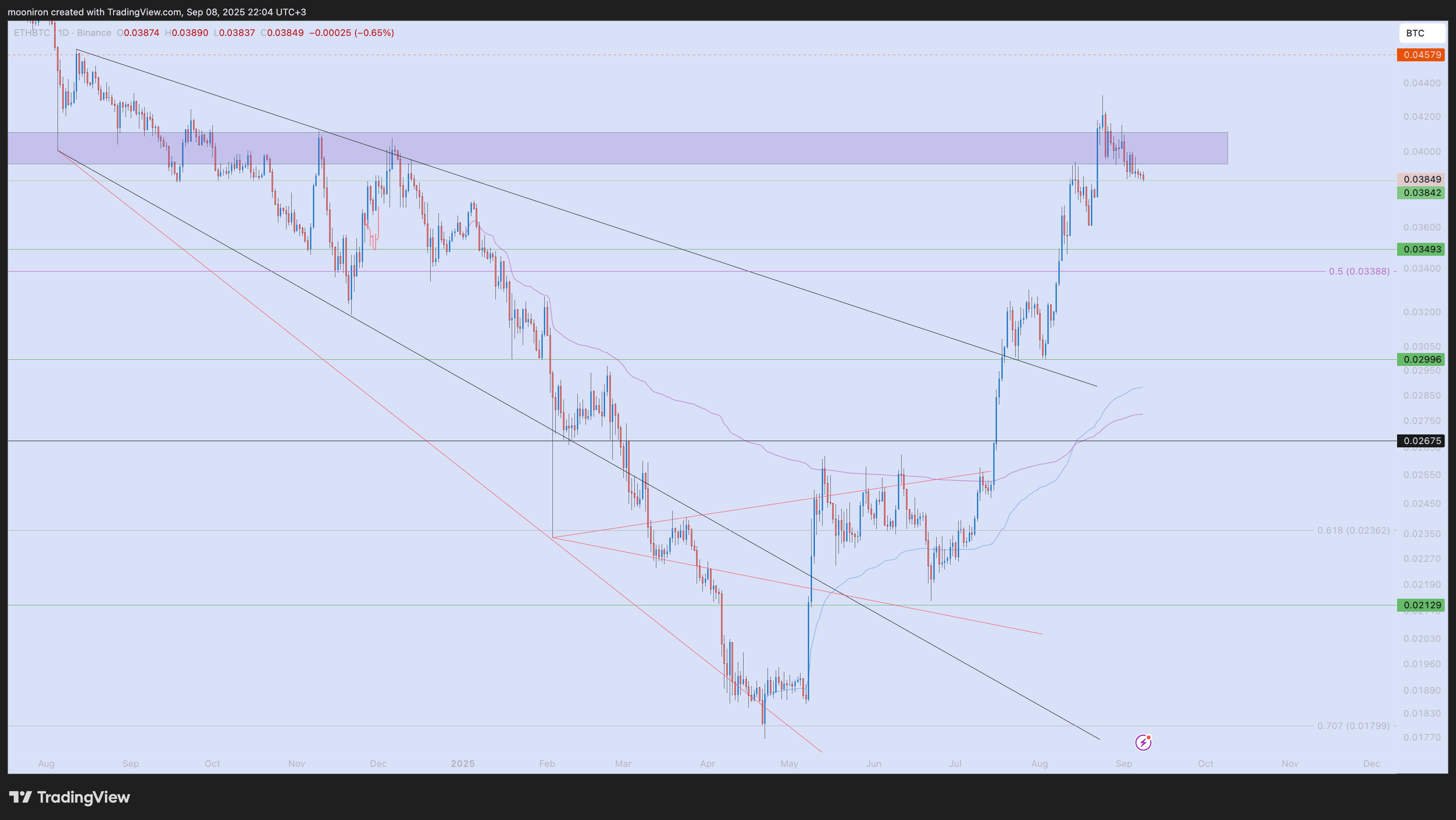 上週,由於ETH在BTC面前失去動能,該對出現了一些回調。爲了讓ETH恢復實力,它首先需要在其自己的美元對中果斷突破$4,500的阻力。在此之前,該對可以預期在一段時間內保持壓力。尤其是在經歷了急劇上漲後,失去這裏重要的紫色框支撐使得回調到0.033-0.034區域似乎成爲可能。對ETH進行空頭而對BTC進行多頭可能更爲合理。