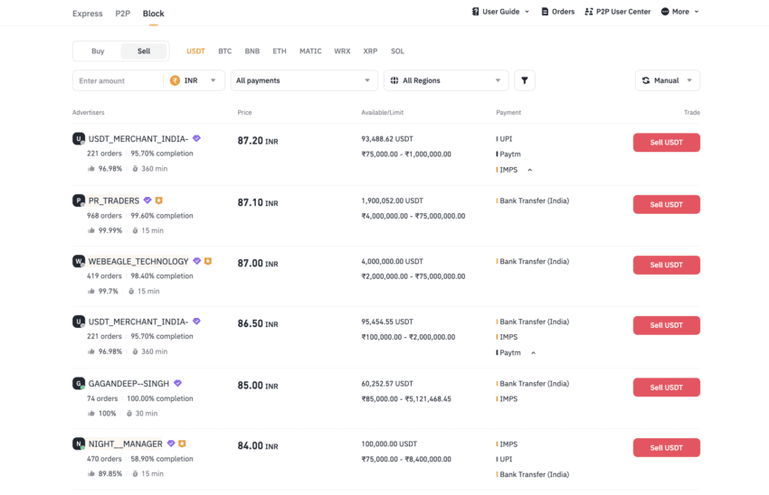 Binance 是全球最大的交易所之一,提供最多的替代幣選擇之一。儘管它在印度沒有正式許可證,但許多用戶依靠其 P2P 平臺將 INR 轉換爲 USDT 等穩定幣。
