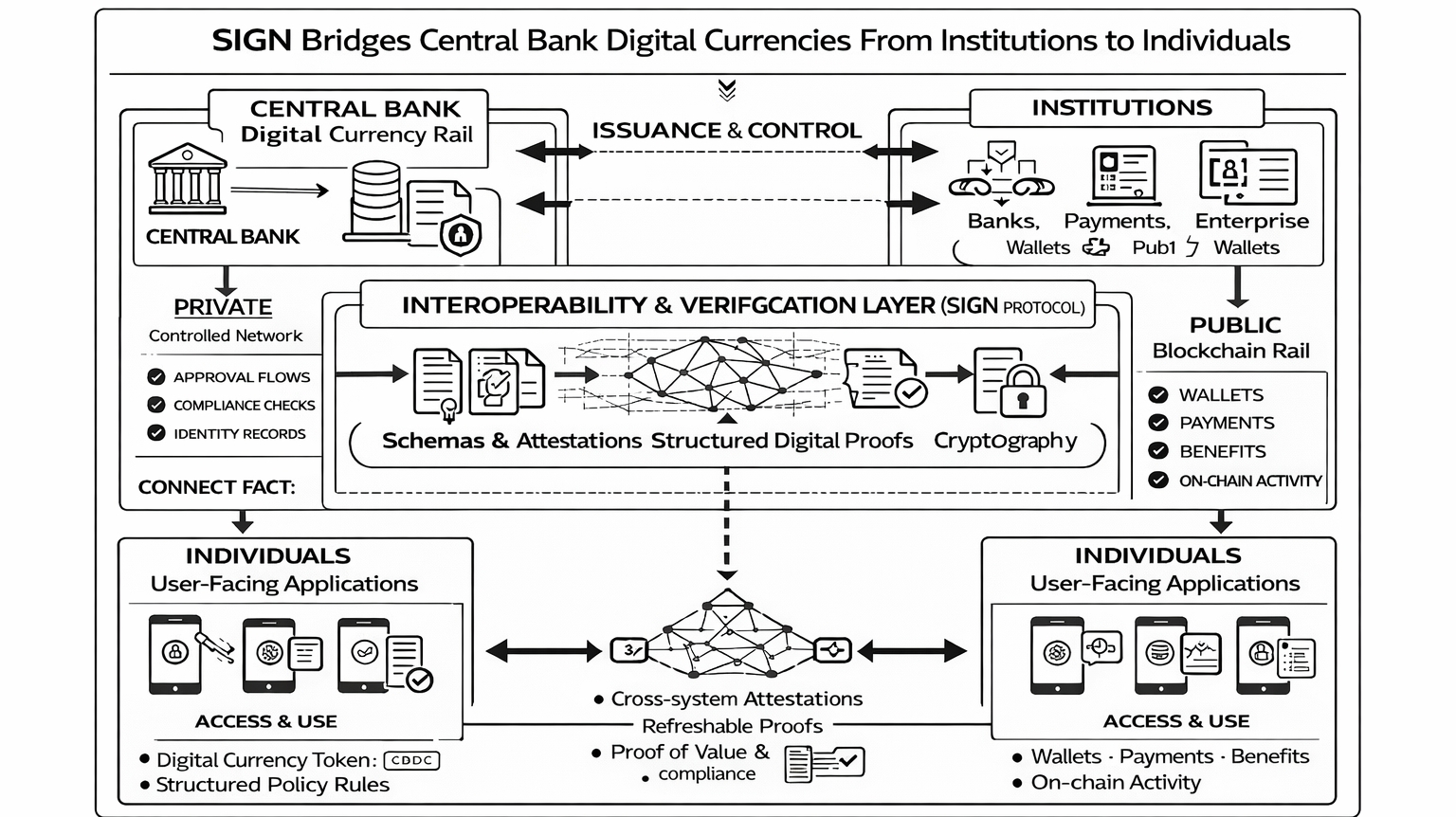 在這個層面上,SIGN作爲不同貨幣系統之間的互操作性層。它支持兩種軌道,如區塊鏈和權限中央銀行數字貨幣環境。關鍵是它標準化了證據的記錄方式。每個行動、發行、轉移、批准都可以與不依賴於單一系統驗證的聲明相聯繫。