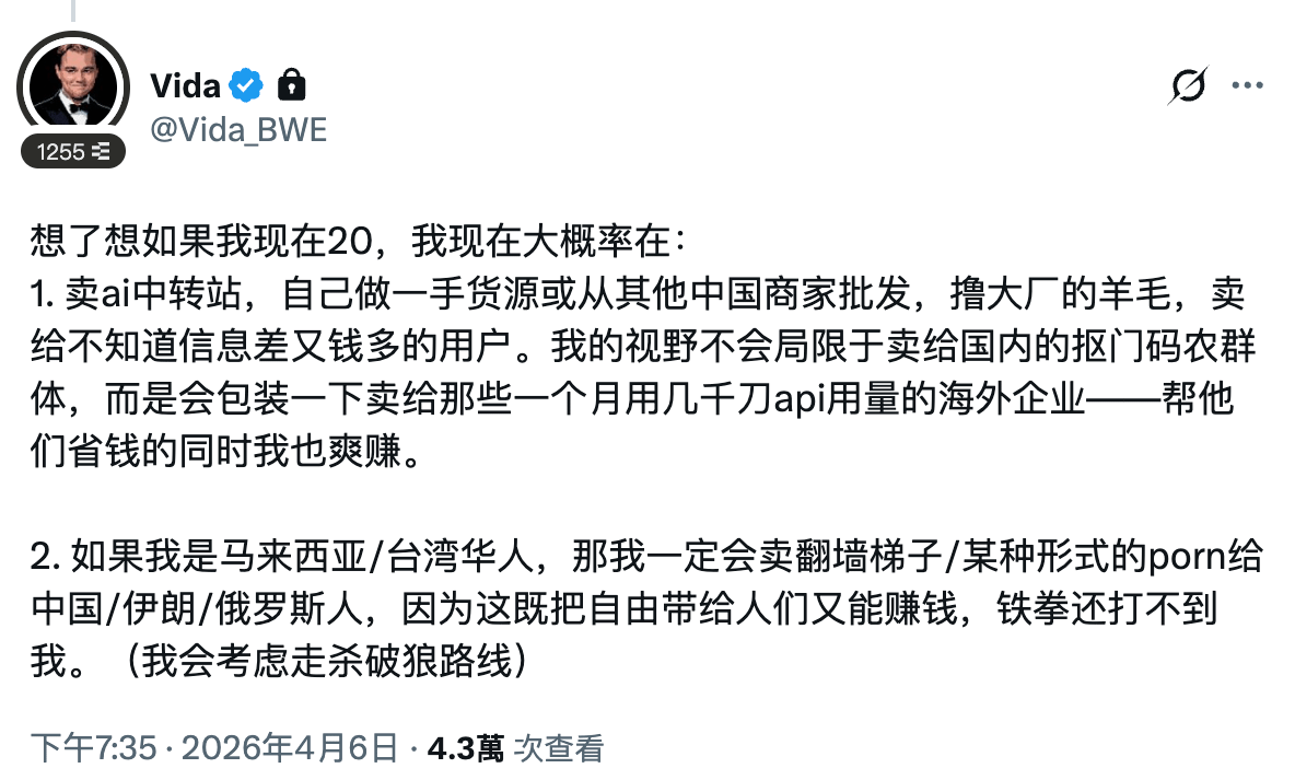 首先是在 AI 工具與 API 的套利市場。Vida 指出,如果自己回到 20 歲,會優先切入「AI 中轉服務」。整合各大模型 API(如 OpenAI、Anthropic 等)並進行二次銷售。他認為,許多海外企業每月有數千美元的 API 使用需求,但對價格敏感度與資訊掌握程度不一,這使得中間商有機會透過批量採購或技術整合,提供「更便宜但可用」的替代方案。