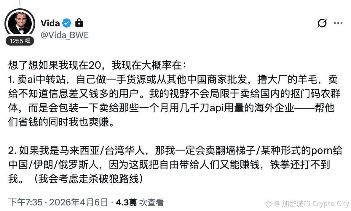 若用 Vida 被蒸餾出的思考框架回頭看他給 20 歲年輕人的三個建議,重點其實不在 AI 中轉站、梯子與情色,或 AI 批量內容這三個賽道本身,而在它們背後共享的同一套賺錢邏輯。
