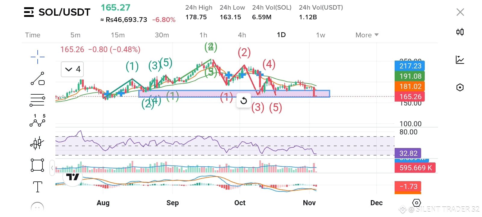在日線圖上,$SOL 已經完成了五波向上的反彈,然後是五波的修正。目前,價格位於約 $163–165 的強支撐區域附近——這個區域之前多次充當穩固的基礎,因此是需要仔細觀察的重要水平。