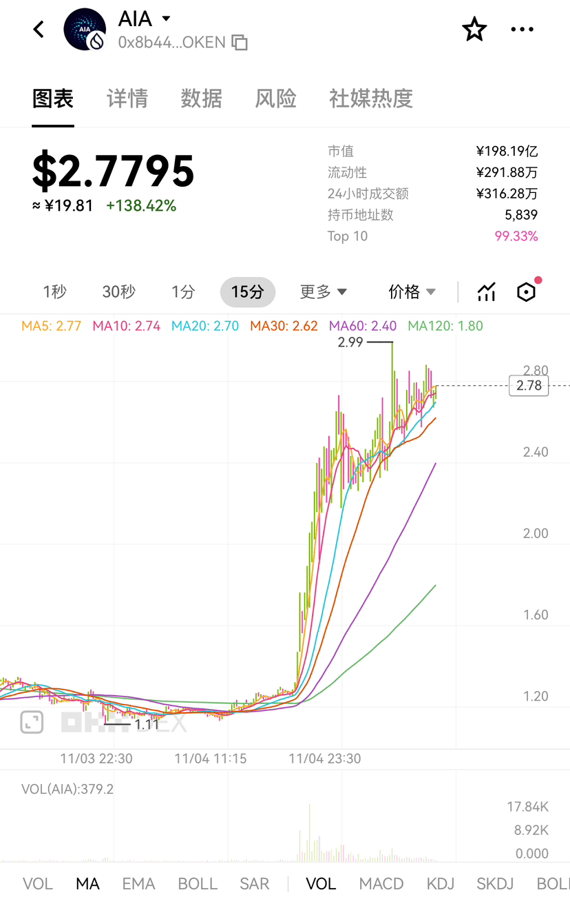 但是 $AIA 卻還在漲(截圖時間11點10分的價格 2.7U),這「逆盤而行」啊,不給上車機會了嗎?還想着跌跌再補一點,現在看來,是想「一騎絕塵」了。