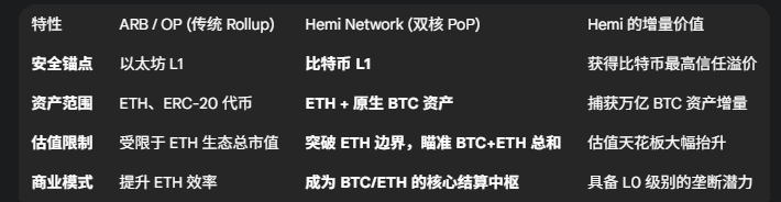 Hemi Network 是安全、原生引入 BTC 資產的最終入口。ARB 和 OP 無法原生且安全地捕獲這部分萬億級別的流動性。