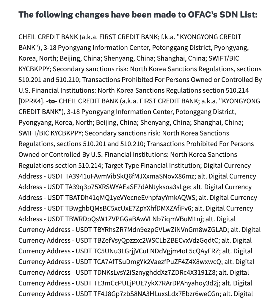 此外,OFAC 在更新 SDN List 時,列出了 Cheil Credit Bank 關聯的 53 個加密貨幣地址。
