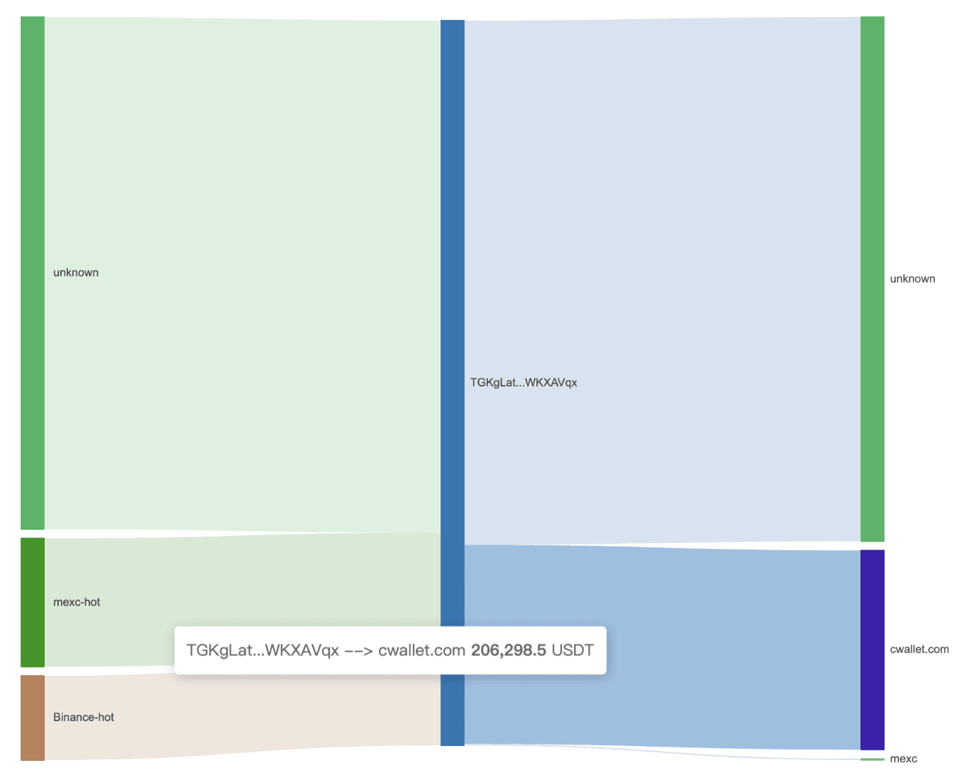 此外,多個地址(如 TGKgL、TBwghb、TMECK)曾向 Binance、MEXC 等平臺充值或轉入。