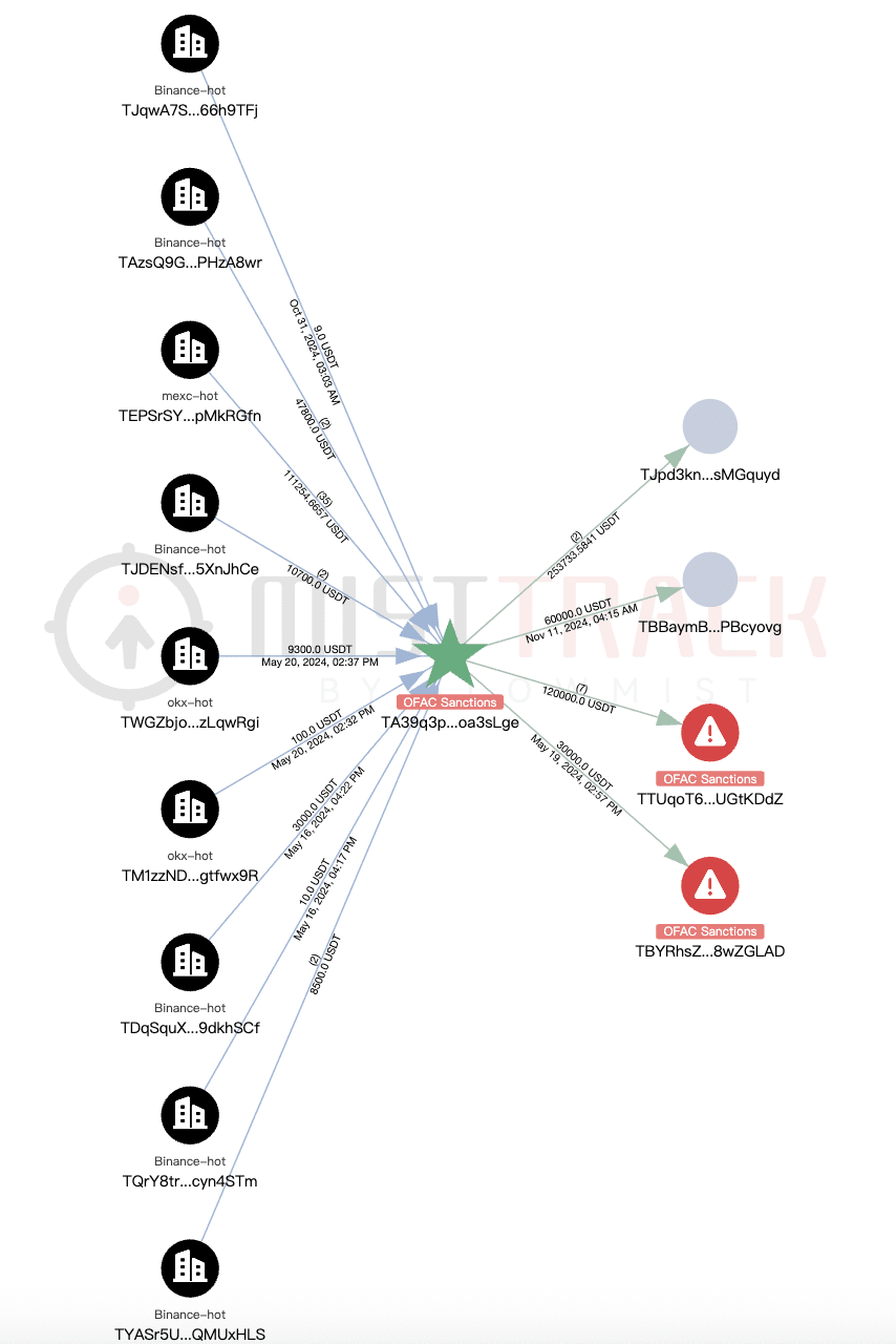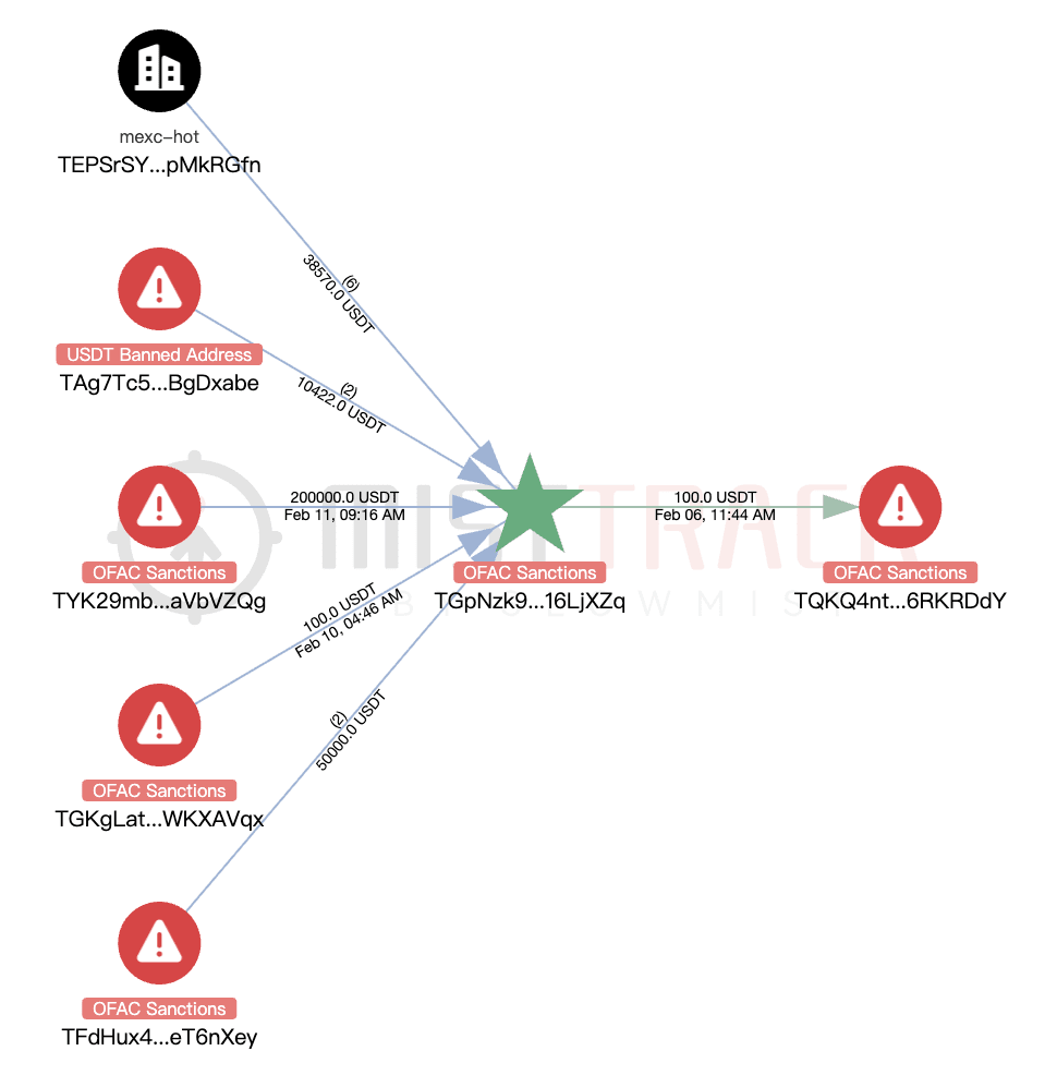 這 53 個地址累計共接收約 1,600 萬枚 USDT-TRC20。資金來源主要集中在幾家主流交易所的熱錢包,也有部分來自此前其他事件中已被制裁的地址。