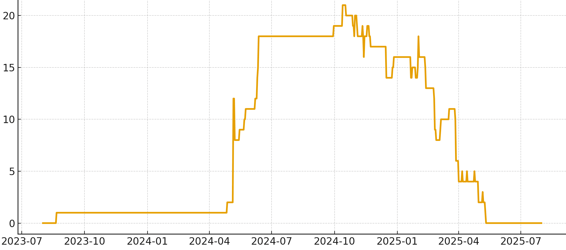從活躍時間來看,這 53 個制裁地址的交易活動覆蓋了 2023 年 8 月 ~ 2025 年 7 月,其中 2024 年中 ~ 2025 年上半年爲密集期。2025 年 1 月 ~ 5 月仍有大量交易,尤其是 5 月份,幾乎每天都有多筆交易;少數地址活躍時間較短,僅幾天到一週(如 5 月 6 日 ~ 5 月 7 日);到了 8 月初之後明顯減少,大部分地址在制裁公告前一週就停止了新交易。