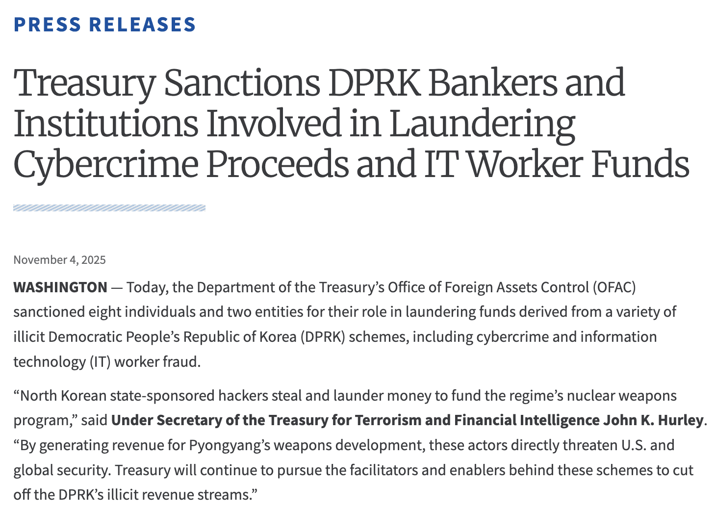 2025 年 11 月 4 日,美國財政部外國資產控制辦公室(OFAC) 宣佈,對朝鮮多名銀行職員及金融機構實施新一輪制裁,此次行動凍結了 8 名個人和 2 家實體在美國境內或由美國人控制的所有資產。這些個人和實體被指控通過網絡犯罪、信息技術(IT) 勞工欺詐等手段爲朝鮮政權籌集資金,用以支持其核武與導彈計劃。