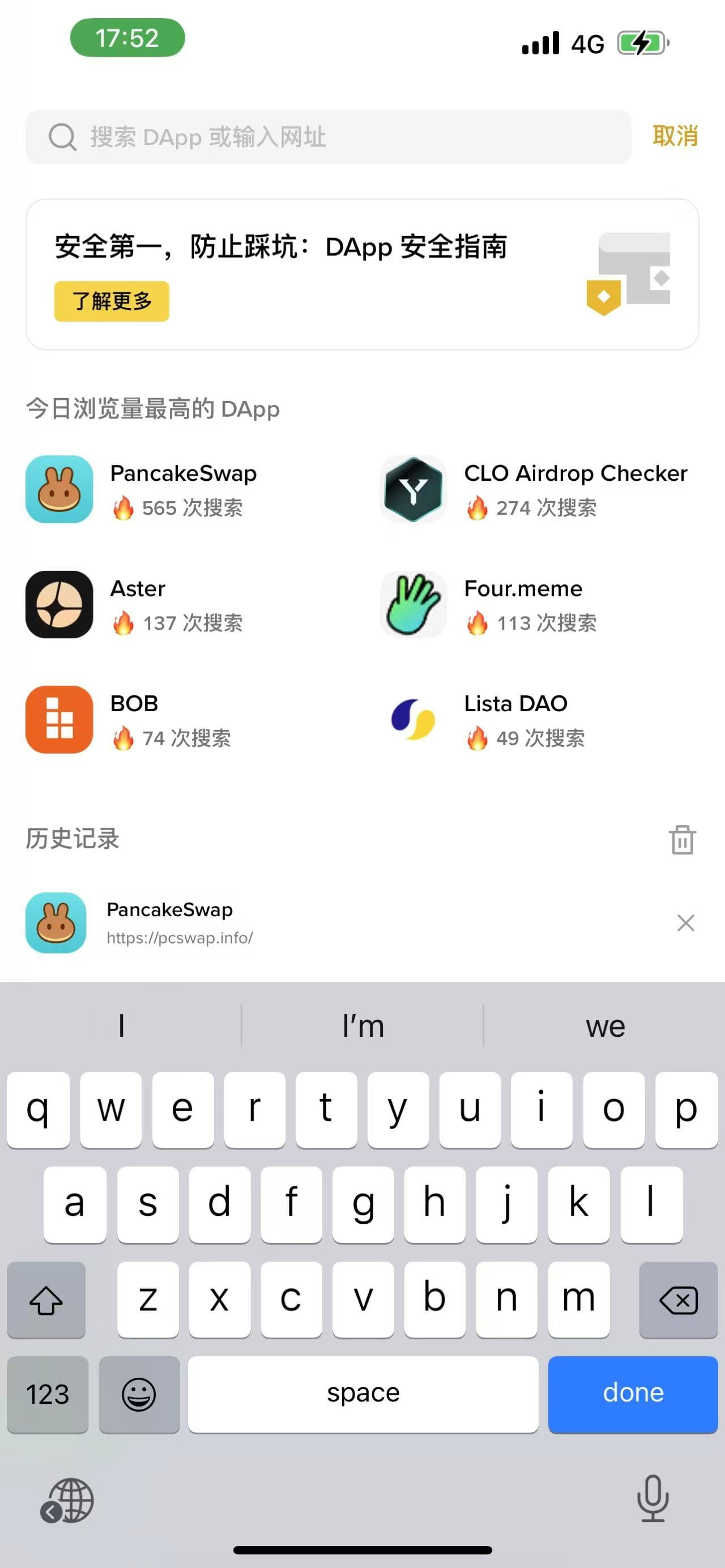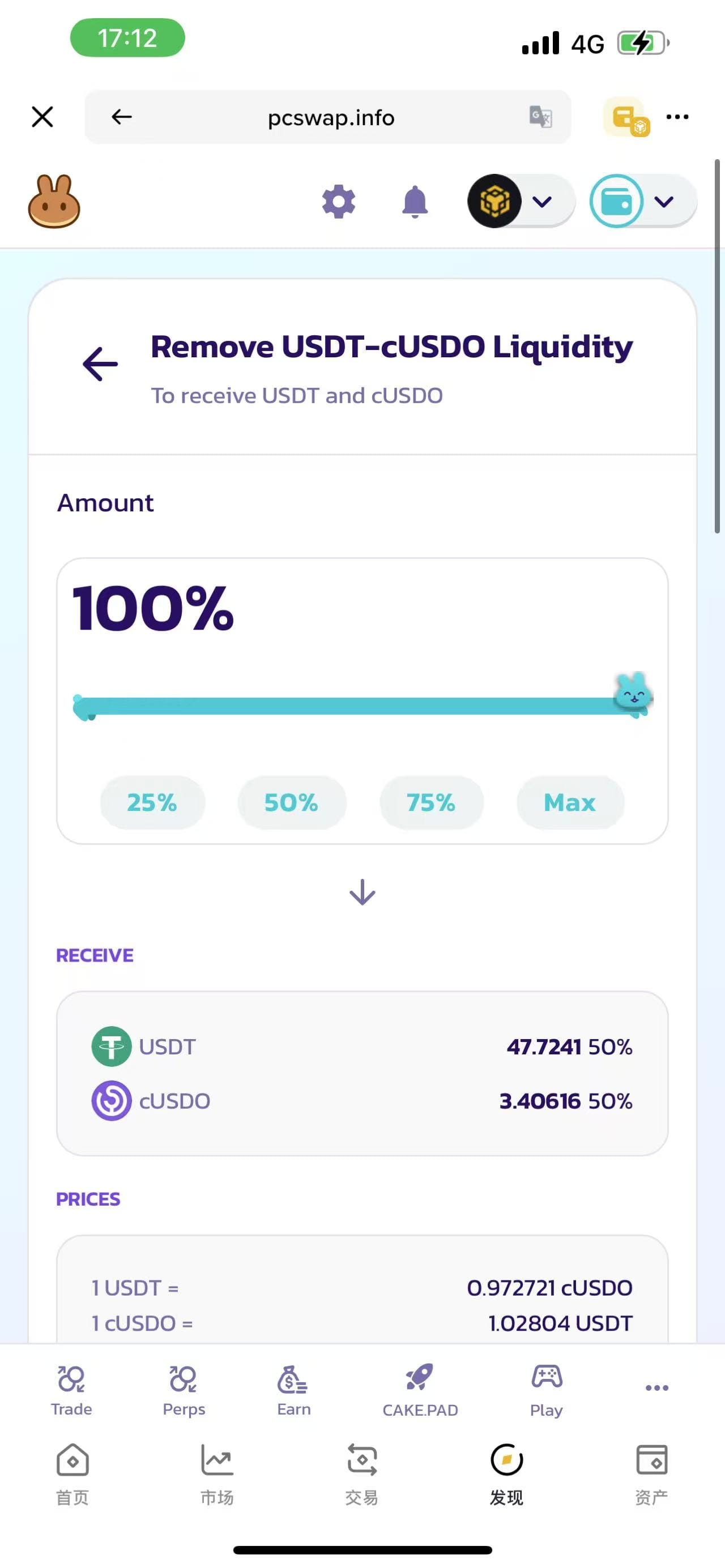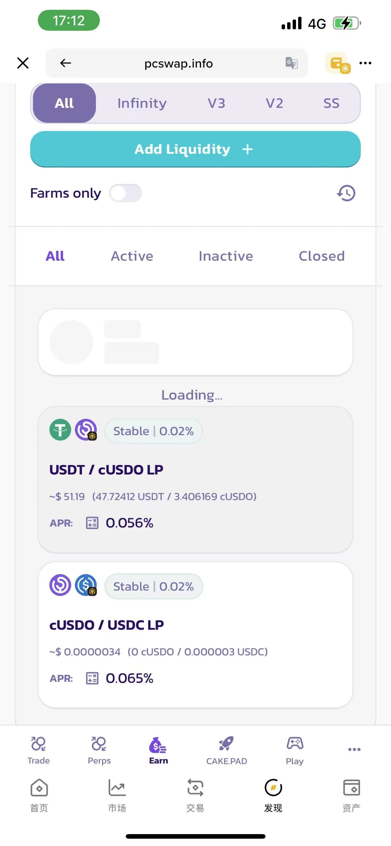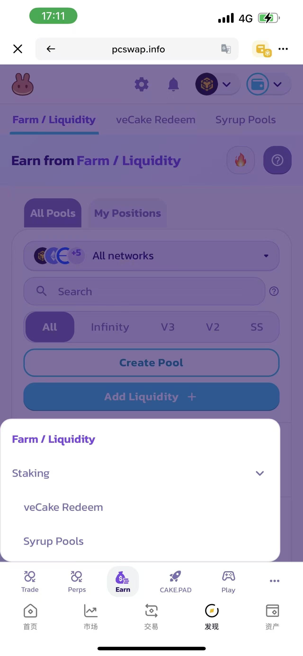 在錢包的 發現頁面 搜索 PancakeSwap,連接錢包後,在最下面導航點擊 Earn -> 選擇最上面的 Farm/Liquidity 選項