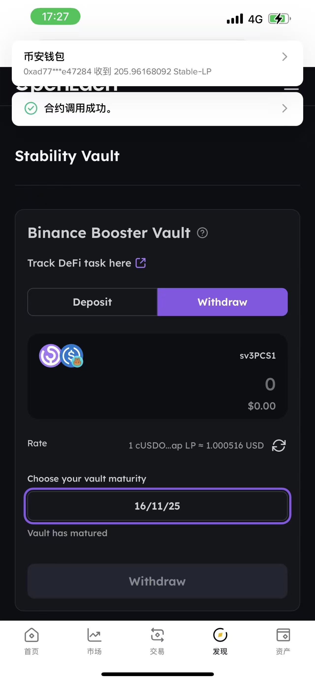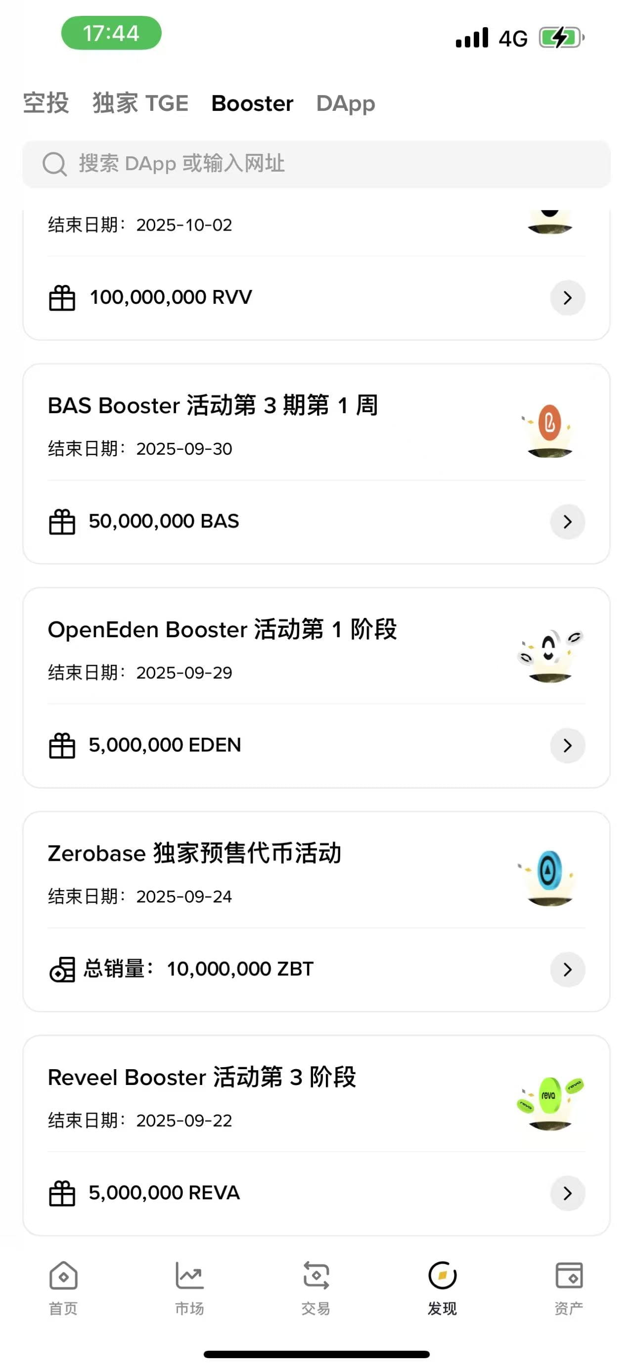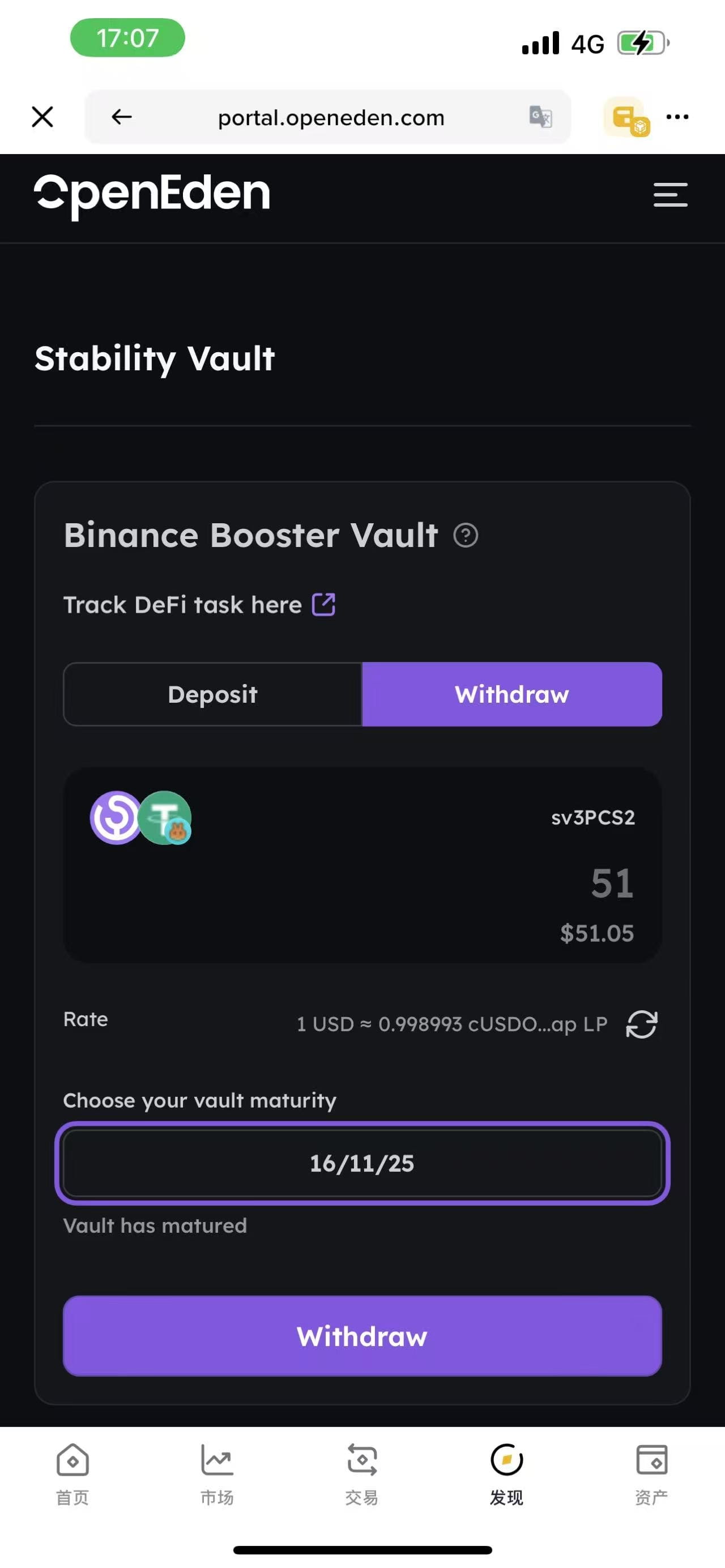 ⚠️ 注意:如果你從 錢包資產 -> DeFi 板塊進入管理 OpenEden 質押,可能會報錯。正確做法是從 歷史的 Booster 任務 入口進入。