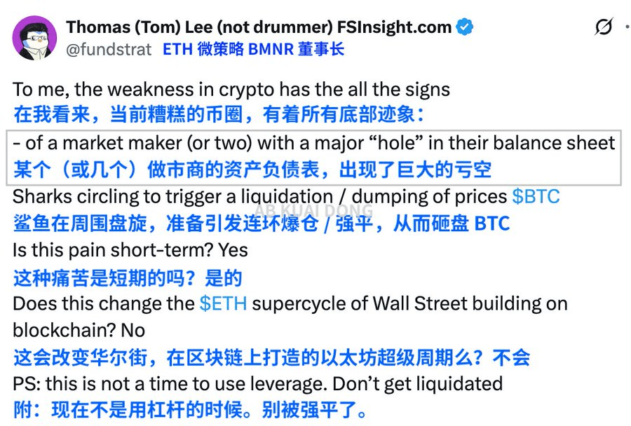 以太坊儲備第一機構 BitMine 的董事長、華爾街分析師 Tom Lee 給出的解釋直接指向做市商。他直言,本輪下跌背後,部分拋售來自 10 月 11 日事件中受損的做市商,而且不止一家。劇烈行情讓這些高頻機構的資產負債表出現缺口,他們開始回收資金、縮減交易、出售代幣。依靠「點差喫飯」的做市商,此時不再是深度提供者,而成了先自救的那個。