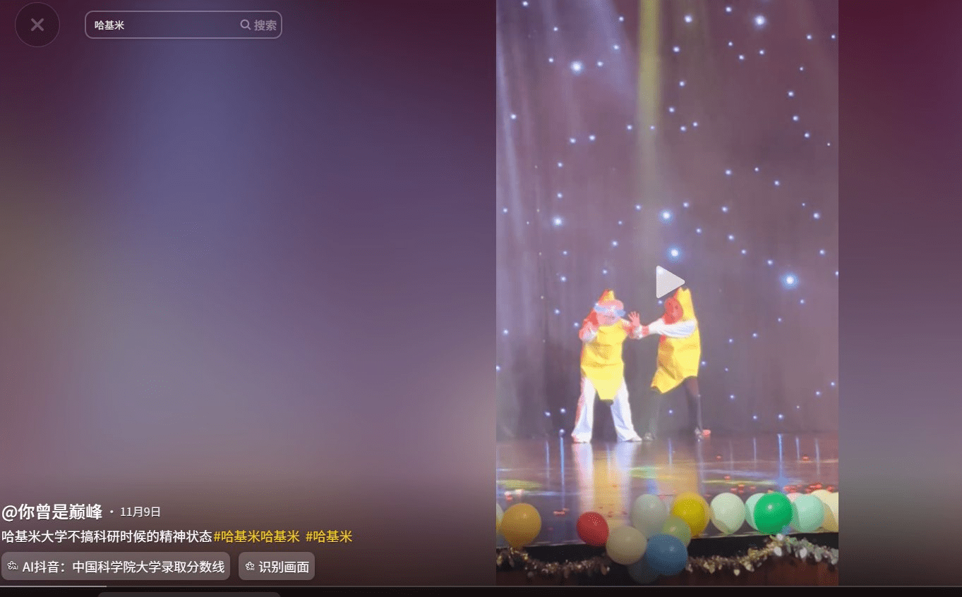 At University of Chinese Academy of Sciences, two students put on full Hakimi mascot suits, performed a silent Hakimi skit to the Hakimi song, and the audience happily filmed the whole thing.