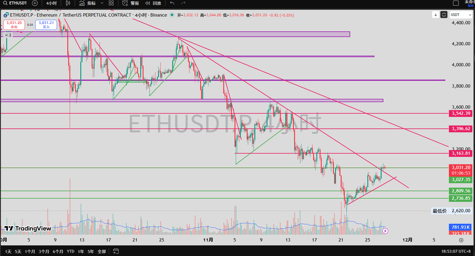 ETH:同步站穩 3020 關鍵支撐,成交量跟 BTC 共振放大,屬於 “錨定反彈 + 獨立資金流入” 雙 buff。