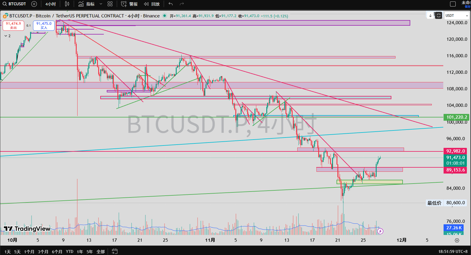 看 4 小時圖:BTC:成交量爆到 120 億級別(近 24 小時),突破前期下降趨勢線,回踩 91500 確認支撐,均線已經拐頭成多頭排列;