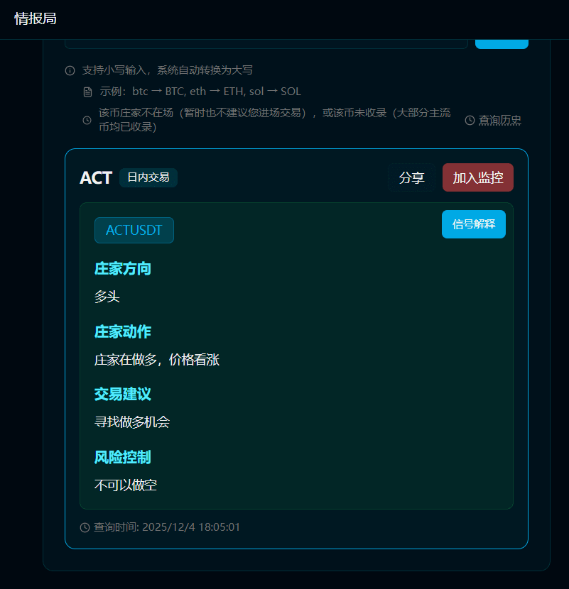情報局分析:莊家方向明確多頭,動作標註 “做多看漲”,交易建議 “尋找做多機會”,風險控制強調 “不可以做空”—— 這是主力主動引導行情的信號,做多是當前契合主力節奏的選擇。