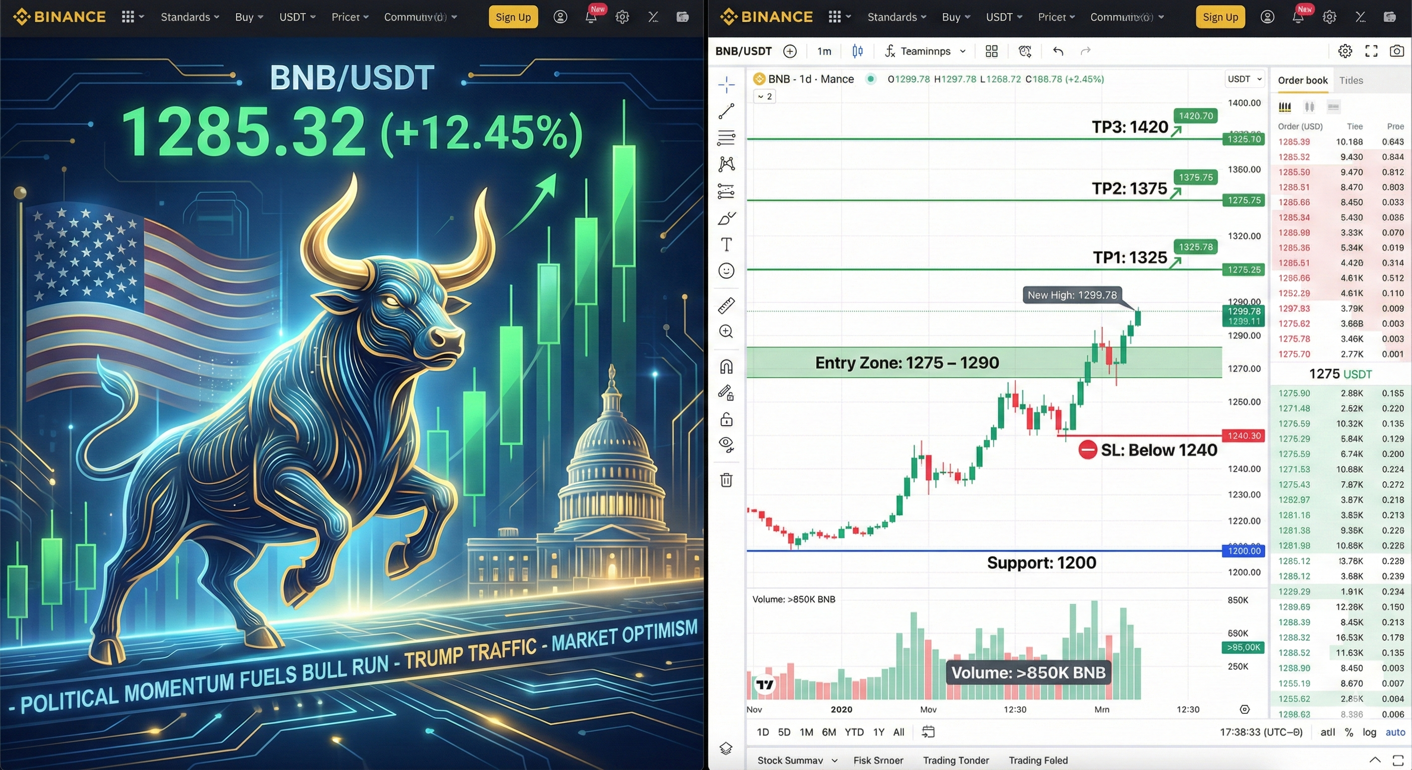 "一個專業、時尚的Binance風格交易圖形,適用於BNB/USDT交易對。中央焦點是一個強大、風格化的公牛,向上翹起的角,推動着一個大型綠色蠟燭圖向上。當前價格'1285.32 (+12.45%)'以大而閃亮的數字 prominently displayed。背景中,有微妙的綜合圖形代表美國政治新聞,例如一個風格化的美國國旗、國會大廈的圓頂,以及帶有文本'POLITICAL MOMENTUM FUELS BULL RUN'和'TRUMP TRAFFIC'的數字新聞滾動條。整體色調以Binance藍色和金色爲主,充滿動感和活力。"