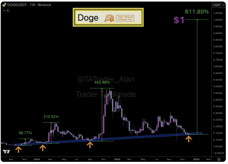 但跌歸跌,這位置可是藏着 “暴富彩蛋”!DOGE 現在正踩上了過去兩年的 “黃金支撐線”—— 這線牛得很,2023 年底至今已經測了三次,每次跌到底就反彈,而且一次比一次瘋:第一次八週漲 87%,第二次十週飆 210%,第三次更狠,14 周直接漲 442% 衝到 0.48 美元!分析師都說,只要這支撐能守住,2026 年初說不定能暴漲 610%,直接摸到 1 美元大關!
