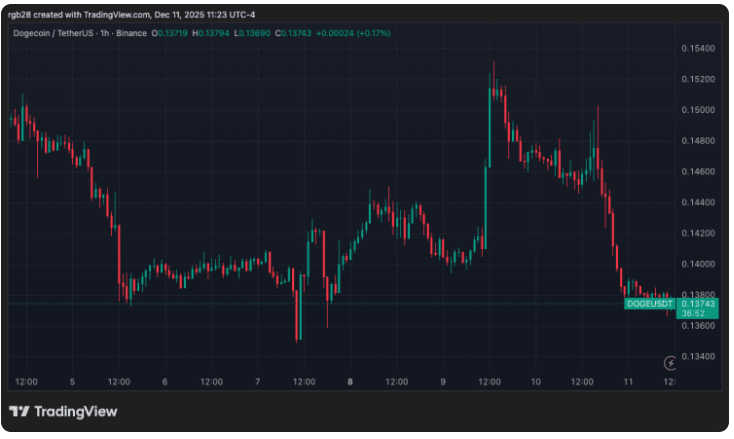 狗狗幣(DOGE)這波跌得有點狠!日線直接砸了 5.5%,周線更慘,跌超 8%,現價 0.137 美元,又回到了 0.136-0.138 美元的老區間躺平。第四季度以來都快腰斬了,一直在 0.13-0.155 美元之間來回晃,本想這周衝一波,結果週三被美聯儲消息帶崩,盤中跌 4.6%,直接打回原形~