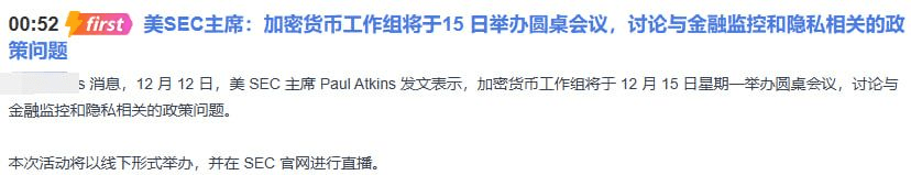 先看第一條勁爆消息:北京時間12月12日,美國SEC主席Paul Atkins發話,他們家的加密貨幣工作組要在12月15日辦個圓桌會議,重點討論金融監控和隱私政策。會議線下開,SEC官網還同步直播!