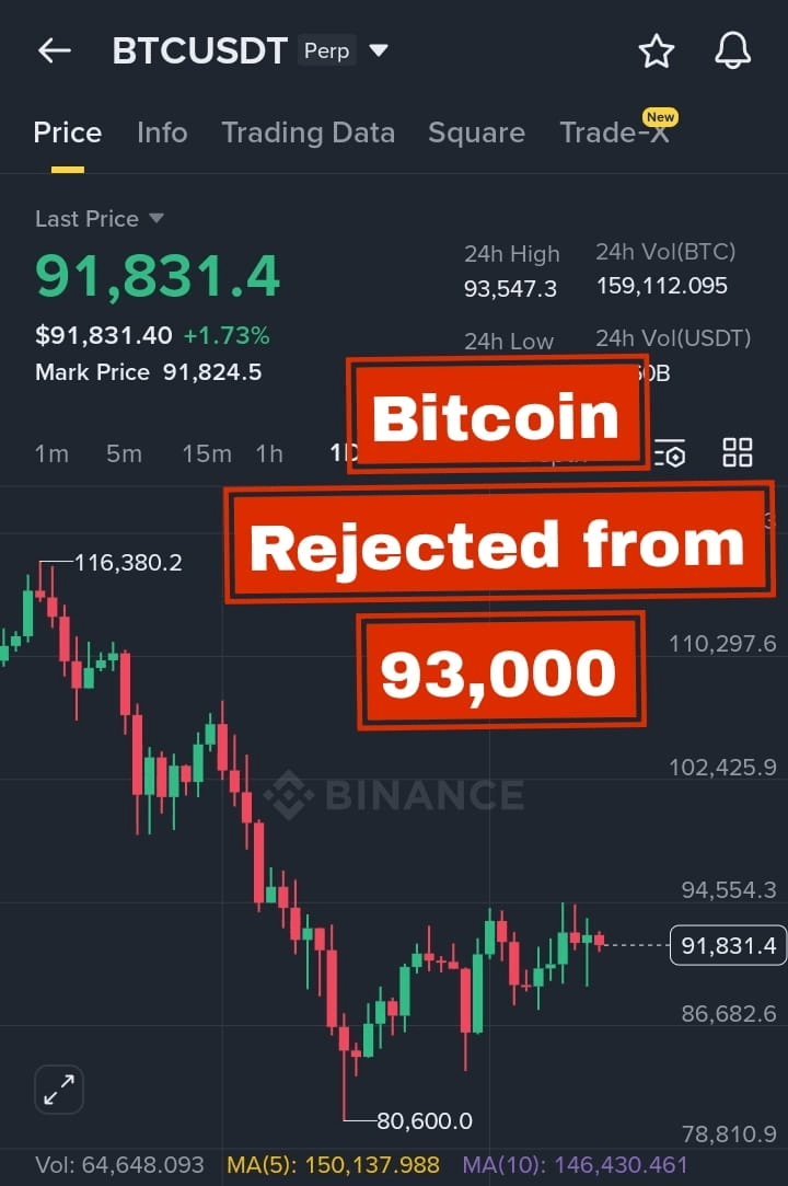 市場整體情緒仍然疲軟:山寨幣繼續流血,資本外流上升,流動性正在減少。這種環境通常會在像93K-94K這樣的拒絕區後產生劇烈的下行走勢。除非BTC突破並以強勁的交易量收於94K之上,否則反彈仍然是短期機會。