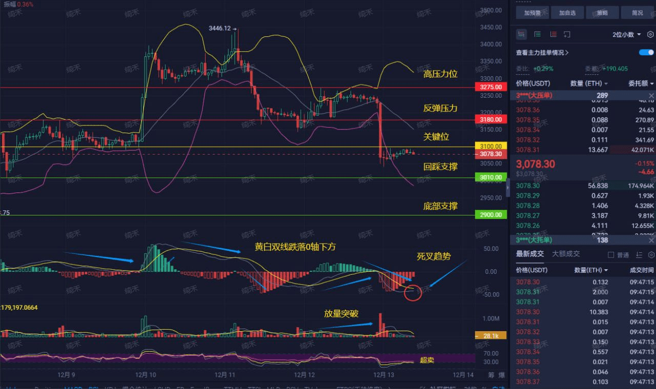 趨勢向下:價格被一堆壓力位壓得死死的,關鍵支撐3100和3078近在咫尺。