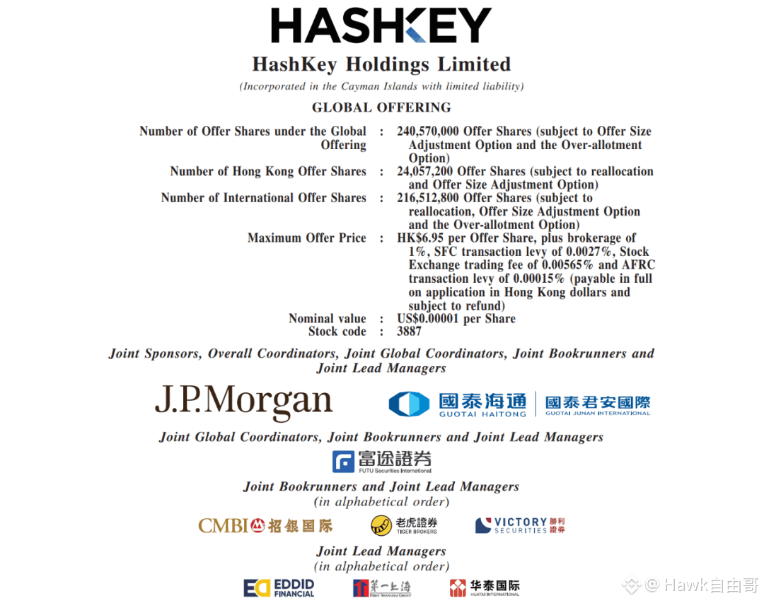 投资者的认购期从12月9日上午9时(香港时间)开始,持续至12月12日中午。若一切顺利,HashKey IPO最终定价将于12月16日确定并公布,股票将于2025年12月17日正式开始交易,股票代码为“3887”。此次IPO的联席保荐人由摩根大通(JP Morgan Chase)和国泰君安国际(Guotai Junan International)等知名金融机构担任。