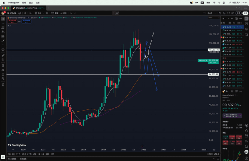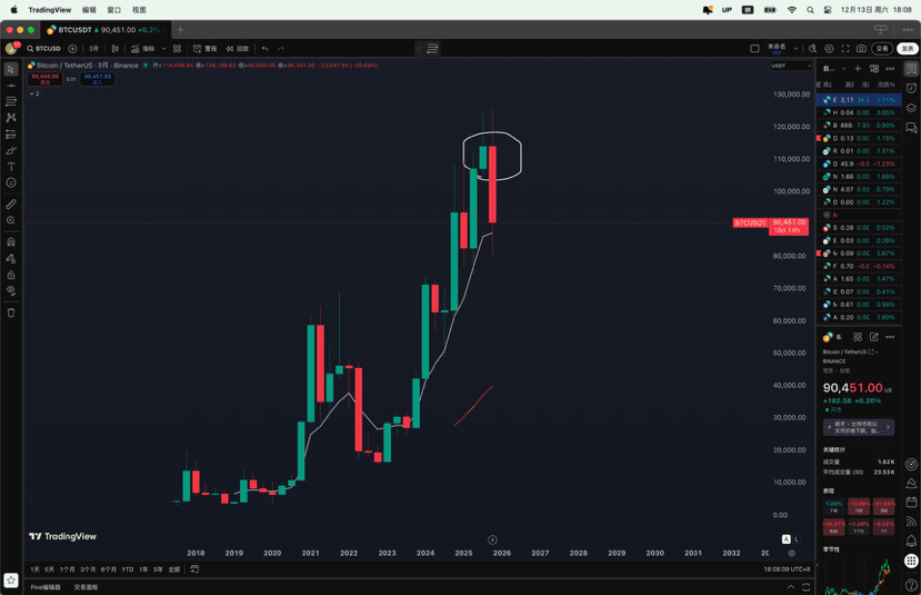 7月的季度k縮量上漲且收出了較長上影線,出現築頂跡象,然後當前10月季度線k放量吞沒,改變了上行趨勢,當前處於一個偏空的狀態,但是具體呢還是要等收線,但不管這個季度收線如何,下個季度k依然會有一根下影線往下踩一下,就算上漲也會有回調踩出下影線再上,那麼策略就是如果下個季度開盤向上,就在高位尋找做空機會,如果開盤向下,那就在低位尋找做多機會。如果2026.1.1季度收線不好,那麼可能後面操作大方向就是逢高空,如果收線還不錯,那麼就可以操作一些做多機會。