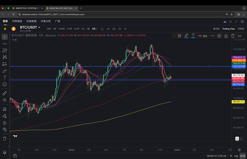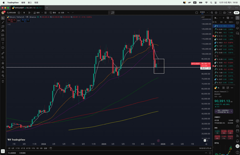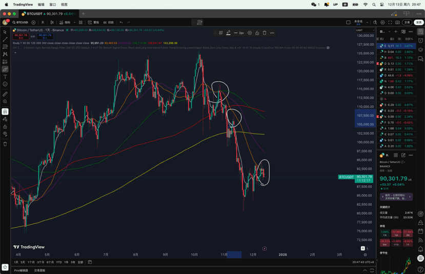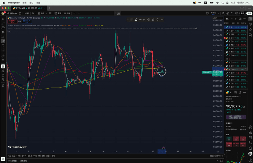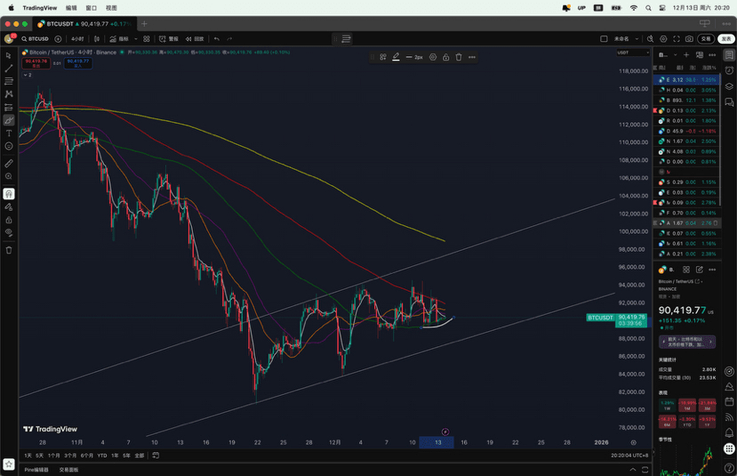 從10月份的下跌以來,第一次嘗試突破ma30, 但又被打下來,12.12的k線吞沒前期的漲幅,行情轉弱,反彈第一個壓力在91000附近,如果想重新反彈,需要k線走一走進行修復。