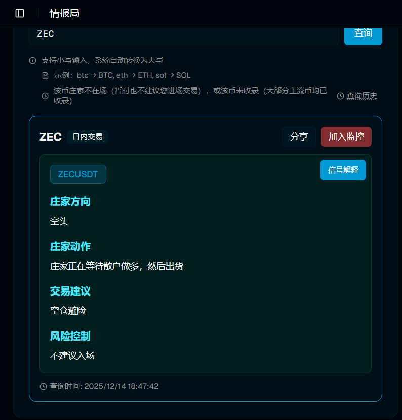 這個工具精準抓住主力“等接盤再砸”的套路,幫你避開無謂虧損。ZEC短期偏空,情報局+作戰室在手,冷靜等真機會最穩!