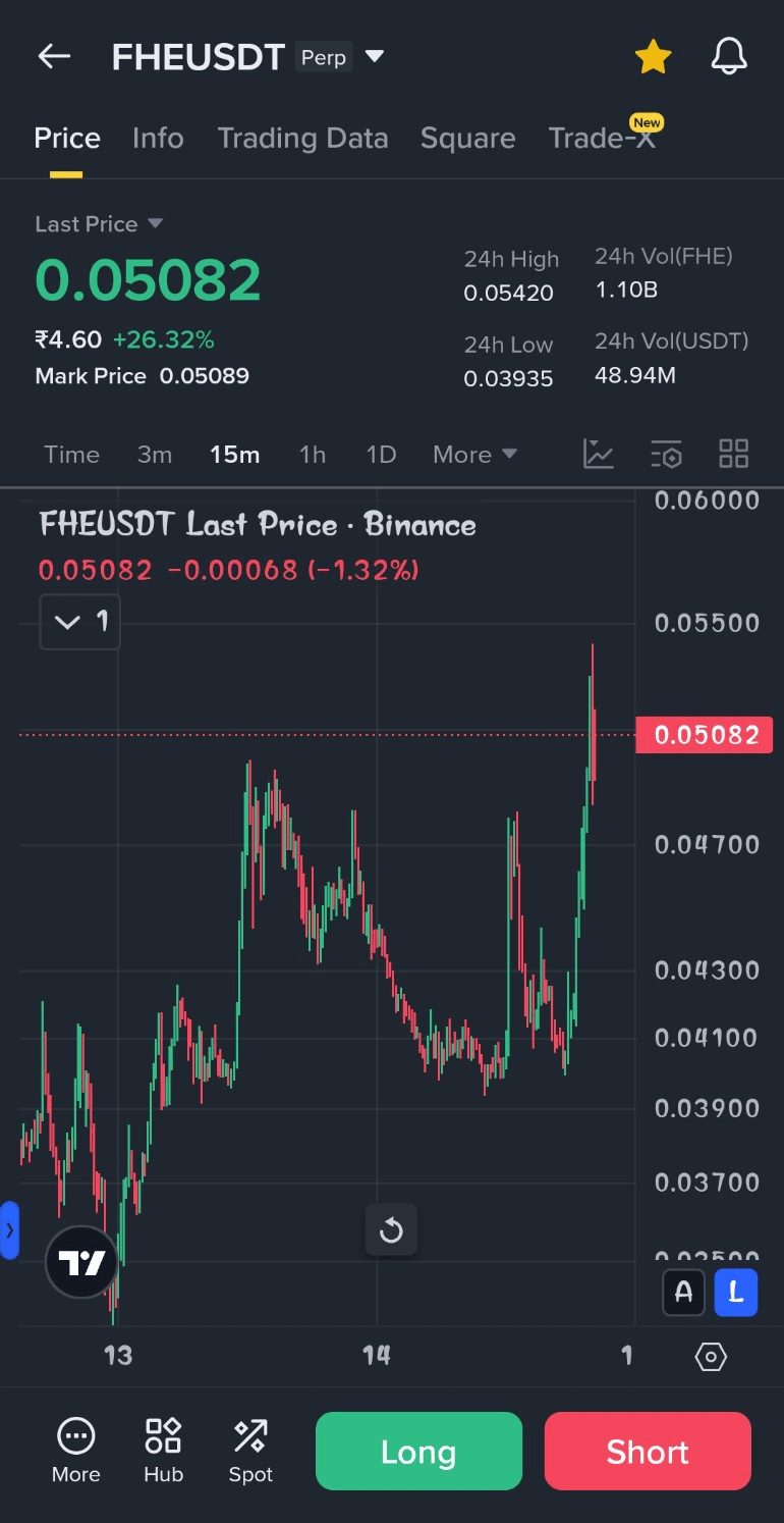 FHE 顯示出強勁的動能,上漲 +26.32%,成交量高(1.10B FHE),並在 0.03935–0.05420 之間有清晰的區間。