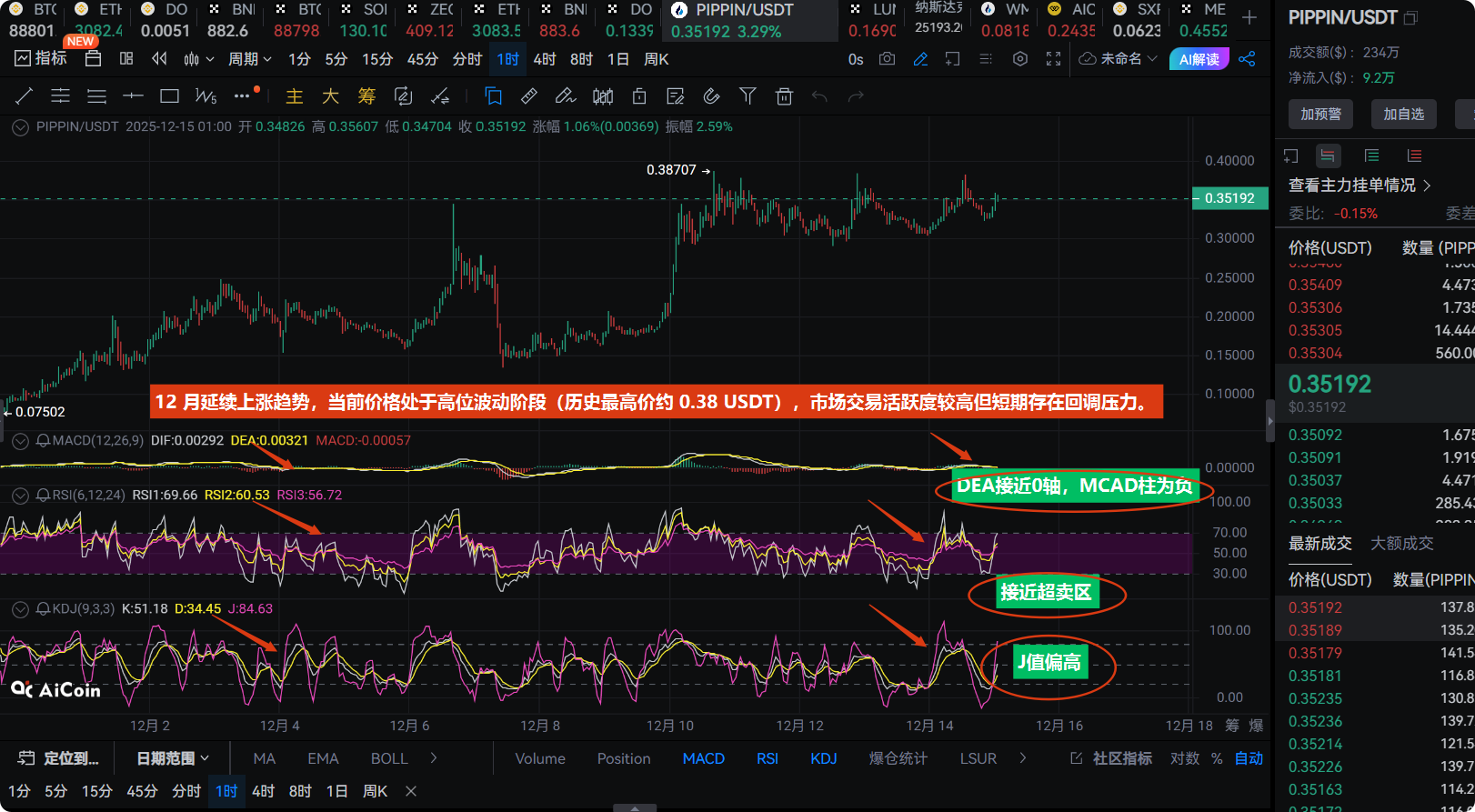 再看盤面的技術面:1 小時線的 RSI 摸到 70 附近,KDJ 的 J 值都快頂到天了,這叫 “超買區蹦迪”;但 MACD 還在 0 軸附近黏着,沒出死叉 —— 這就像個喝高了的壯漢,腳步飄但沒摔,只要沒人突然抽他凳子(比如巨鯨砸盤),還能晃悠會兒。我個人的判斷是:今天大概率是 “橫盤震盪 + 小回調”,支撐位看 0.34,要是能守住,下午可能還能衝一波 0.36;要是守不住,跌到 0.32 也別慌 —— 畢竟昨天剛破了前高,市場情緒沒那麼快涼透。