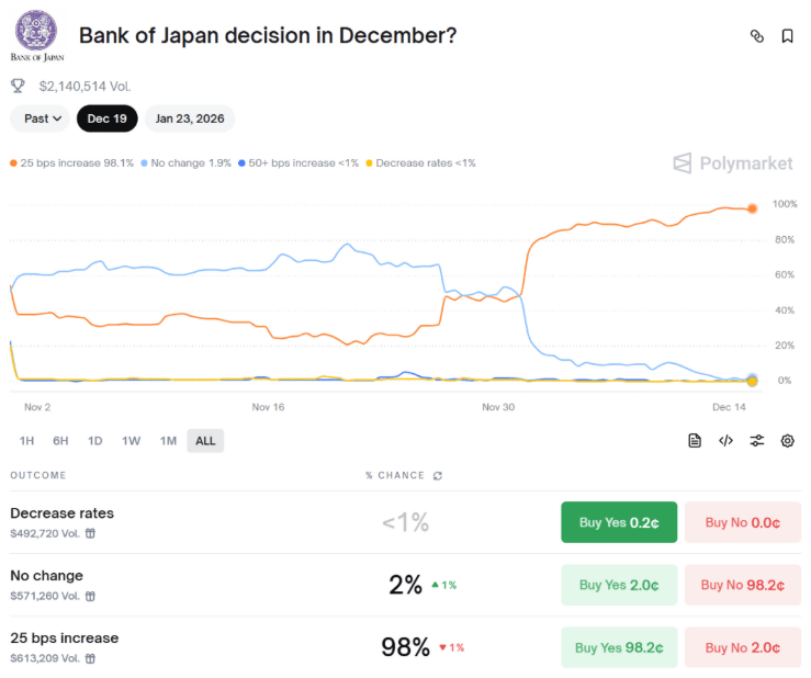 現在市場都在賭日本央行會動手:預測平臺 Polymarket 顯示,加息 25 個基點(從 0.5% 漲到 0.75%)的概率 98%,維持不變才 2%,基本沒懸念。