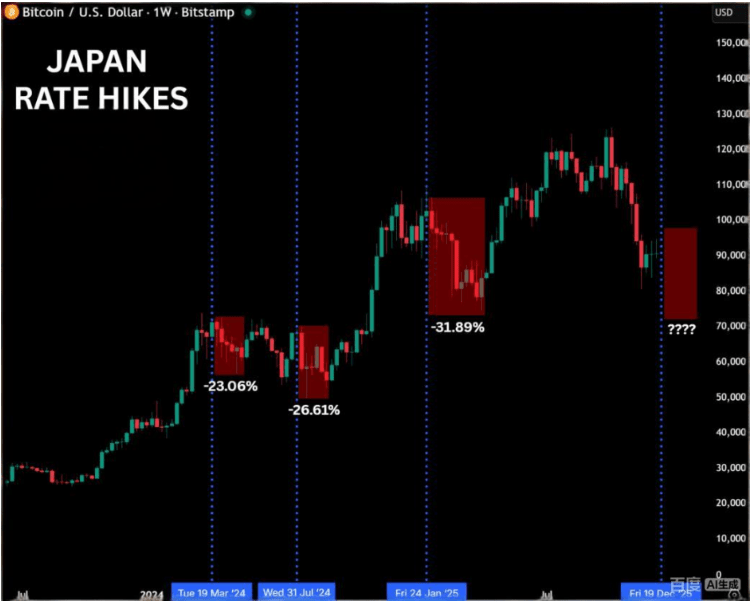 加密圈剛從美聯儲降息的溫柔鄉里緩過來,又要面臨 “致命一擊”!日本央行下週(12 月 18-19 日)開貨幣政策會議,加息概率直接飆到 98%,幾乎是板上釘釘的事兒~ 關鍵是,這玩意兒堪稱比特幣 “暴跌開關”——2024 年以來三次加息,比特幣每次都跌超 20%,這次怕是要懸!