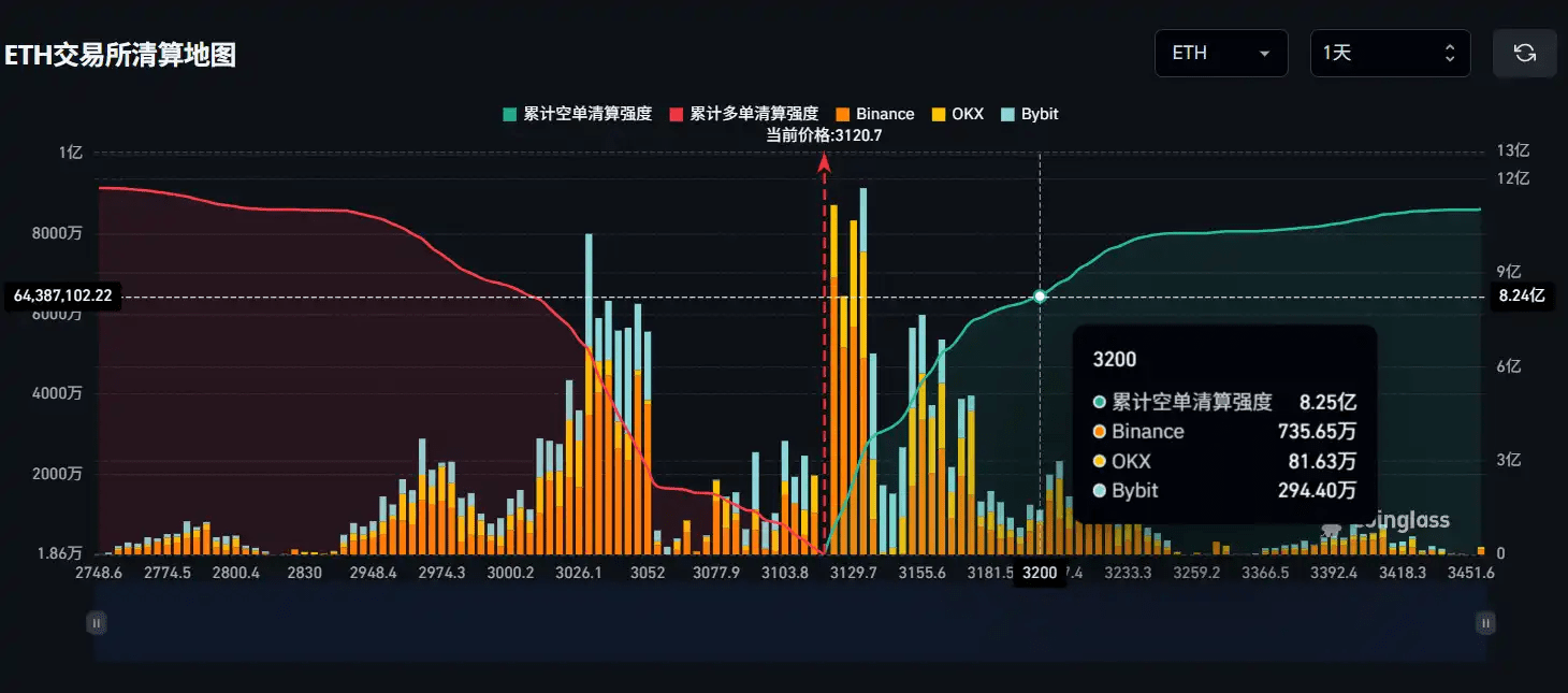 當前ETH正處在兩個關鍵清算閾值之間:下方3000美元有約8.65億的多單清算強度,上方3200美元有約8.25億的空單清算強度。這意味着:
