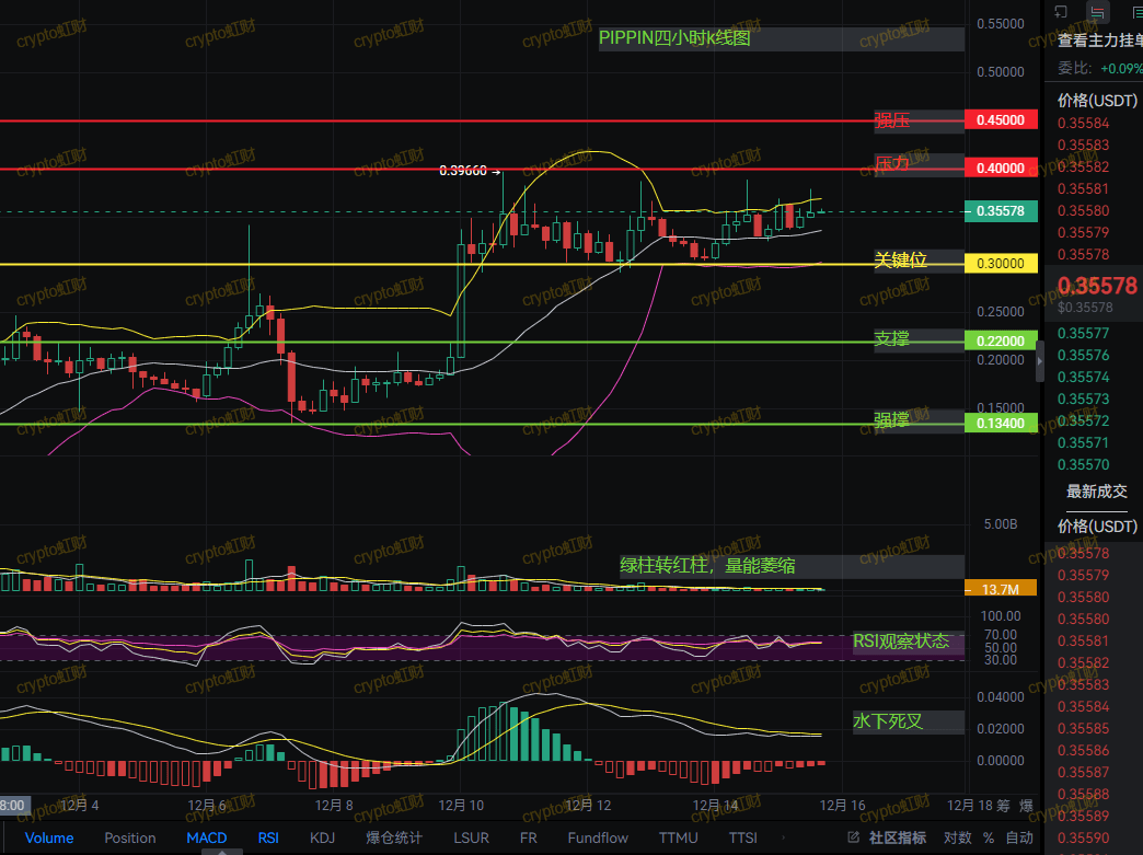 價格在0.355附近震盪,上方壓力在0.40,下方支撐在0.22、0.134。MACD出現水下死叉,RSI也在高位走平,這是短期調整信號。量能沒有繼續放大,說明追高資金開始謹慎。