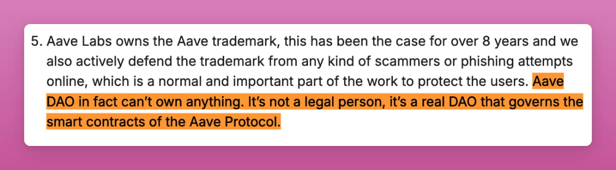 Aave DAO 不拥有知识产权,因为 DAO 不是法律实体,不能持有商标或在法庭上强制执行商标权。