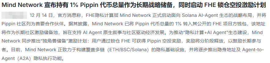 今天凌晨,Mind Network高調宣佈持有1% Pippin代幣作爲戰略儲備,還啓動FHE鎖倉空投計劃,搞得好像隱私計算+AI Agent要起飛似的。