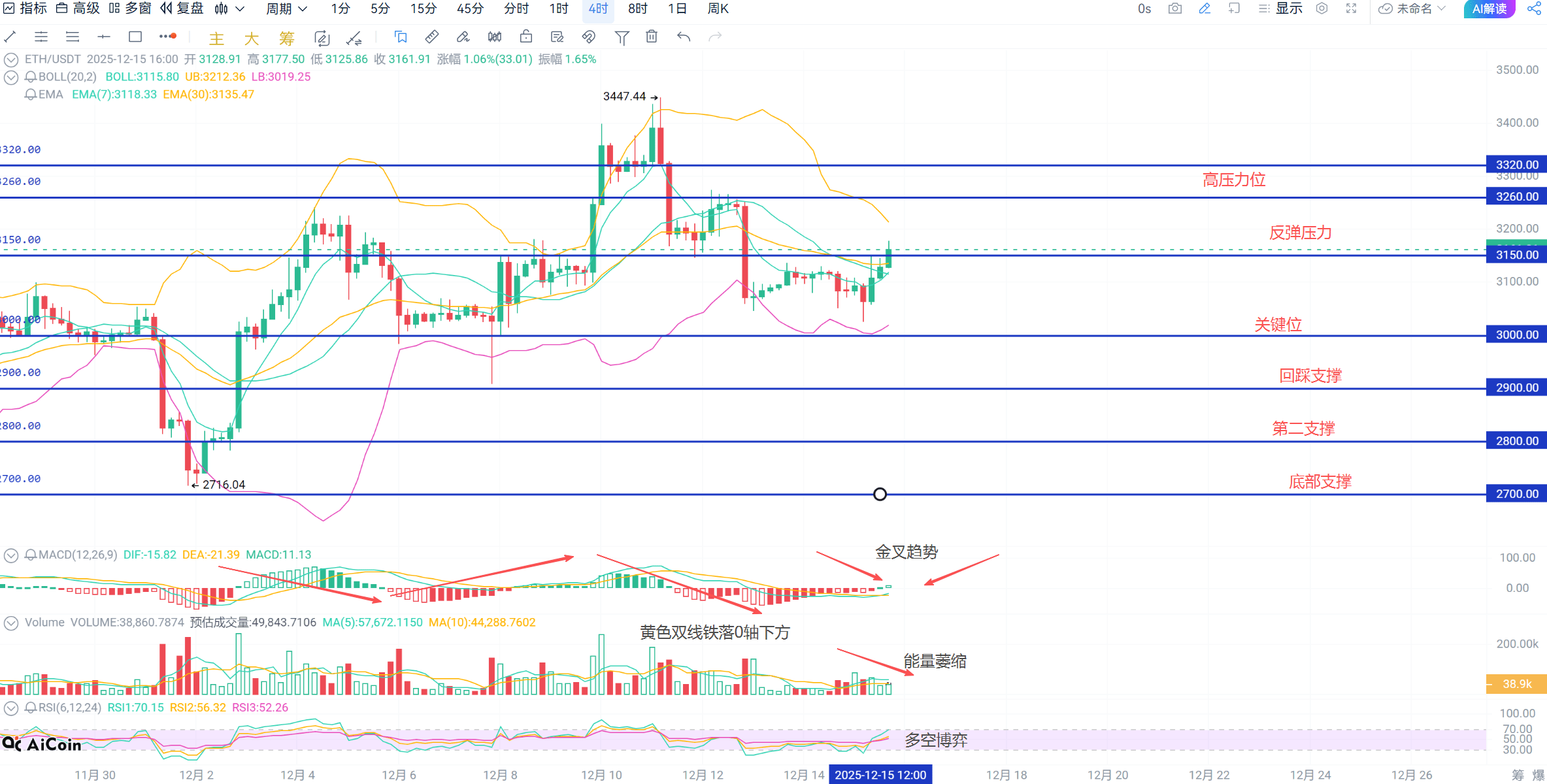 截至12月15日18:00,ETH價格在3080 - 3120美元區間內窄幅震盪,彷彿是在暴風雨來臨前的短暫平靜。多個技術指標已經發出了警報信號,就像黑暗中閃爍的警示燈。布林帶壓縮至年內最窄水平,MACD指標在零軸下方徘徊,且動能十分微弱,成交量也持續萎縮。這種“波動率壓縮 + 成交量枯竭”的組合情況,在歷史上多數情況下會在重大事件前後引發單邊行情,就像即將爆發的火山,內部蘊含着巨大的能量。